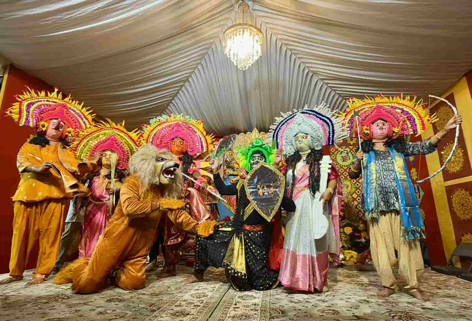 এ বছরের পুজো আরও খানিকটা বিশেষ। কারণ, এই মঞ্চেই ঘটল এক অভাবনীয় ঘটনা— ছৌ নাচের মাধ্যমে জীবন্ত হয়ে উঠল দেবী দুর্গার মহাযুদ্ধ। প্রবাসের মাটিতে বাংলার সংস্কৃতিকে বাঁচিয়ে রাখার যে ঐকান্তিক প্রচেষ্টা, এটি তারই এক উজ্জ্বল দৃষ্টান্ত। পুরুলিয়ার বিখ্যাত এই লোকনৃত্য বাংলার গ্রামীণ সংস্কৃতির শতাব্দী প্রাচীন এক ধারা। মুখোশ, রঙের বৈচিত্র্য, দেহের বলিষ্ঠ ভঙ্গিমা ও নাট্যশৈলীর এক অনন্য মিশেল তৈরি করে এই নাচ।