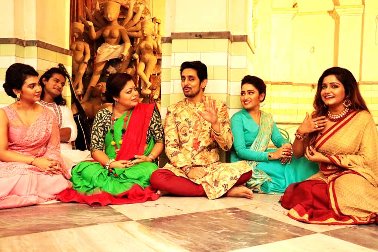 সাদা সরু পারের ধুতি-পাঞ্জাবিতে খাঁটি বাঙালিবাবু হয়ে হাজির গৌরব, বাঙালি মেগার স্বয়ং মহাদেব। অন্য দিকে নরম জর্জেট শাড়িতে হরিণ চোখের সায়ন্তনী। কেবল ধারাবাহিক নয়। ‘উমা’ আর ‘এক যে ছিল রাজা’য় কাজ করার পর ইন্ডাস্ট্রির নজরে এখন তিনি। তাঁর পাশেই ঠাকুরদালানে গা এলিয়ে বসলেন সুদীপ্তা। ধারাবাহিক ‘সাত ভাই চম্পা’র নিয়মিত মুখ। তাঁর লম্বা চুলের দাবি সামলাতে হিমশিম খেয়েছেন হেয়ার ড্রেসার সন্দীপ নাগ। আর সুদীপ্তা? গিরীশ ভবনের জগদ্ধাত্রীর রূপ দেখে মুগ্ধ। বাড়িতে তখন চলছে ‘মায়ের সেবা’।
