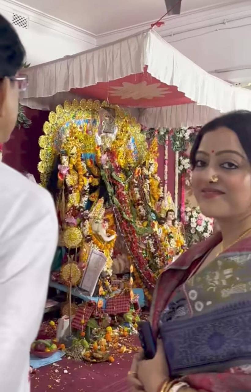 নিজের বাড়ির পুজো, ব্যস্ততা তো তুঙ্গে থাকবেই! তার ফাঁকেই সব কিছু নিপুণ হাতে সামলালেন অভিনেত্রী রূপসা চক্রবর্তী। পরনে হলুদ শাড়ির সঙ্গে মানানসই অলঙ্কার। নাকের বড় নথে যেন তিনি নিজেই উঠেছেন দেবী। স্নেহাশিস চক্রবর্তী এবং তাঁর বাড়ির জগদ্ধাত্রী পুজোতে যেন চাঁদের হাট। একই সঙ্গে একাধিক ছোট এবং বড় পর্দার তারকারা। ব্যস্ততা সামলেও তাঁদের সঙ্গে গল্প আড্ডায় মাতলেন তারকা দম্পতি।