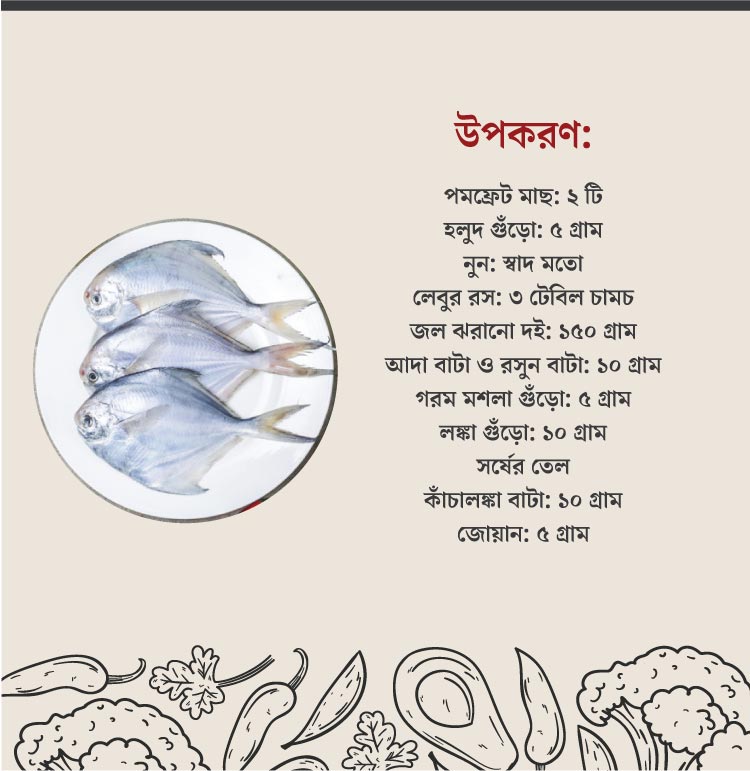 যে কোনও প্রকার তন্দুরি বানানোর জন্য দু’বার ম্যারিনেশন করা খুব দরকার। প্রথম ম্যারিনেশনের জন্য একটা পাত্রে পমফ্রেট মাছ নিয়ে তাতে নুন, লেবুর রস, কাঁচালঙ্কা বাটা, ও খানিকটা সর্ষের তেল ভাল করে মিশিয়ে দশ থেকে পনেরো মিনিট রেখে দিন। তার পর আর একটি পাত্রে জল ঝরানো দই, হলুদ গুঁড়ো, নুন, আদা বাটা ও রসুন বাটা, গরম মশলা গুঁড়ো, লঙ্কা গুঁড়ো, জোয়ান, সর্ষের তেল ভাল করে মিশিয়ে তাতে আগে থেকে ম্যারিনেটেড পমফ্রেট মাছগুলি দিয়ে দিন।