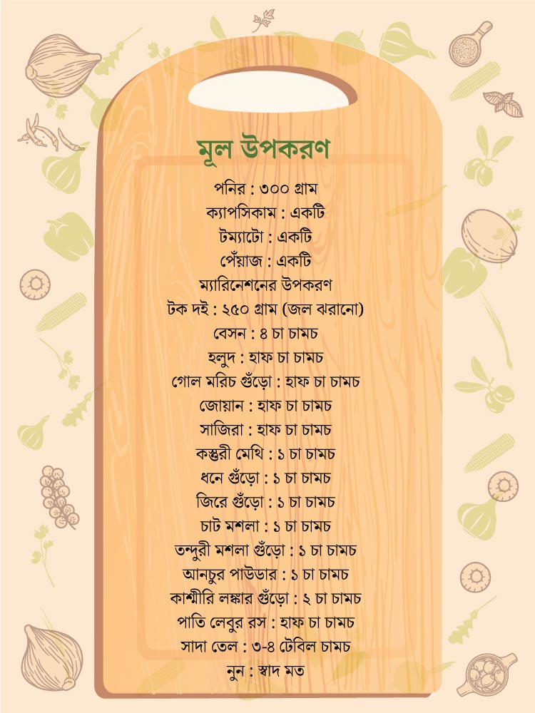 প্রথমে পনিরকে চৌকো আকারে টুকরো টুকরো করে কেটে নিন। এ বার পেঁয়াজ চৌকো করে কেটে তার লেয়ারগুলো আলাদা করুন। ক্যাপসিকাম ও টম্যাটো একই ভাবে পনিরের আকারে কেটে নিন। চাইলে মাশরুম বা বেবি কর্নও দিতে পারেন।