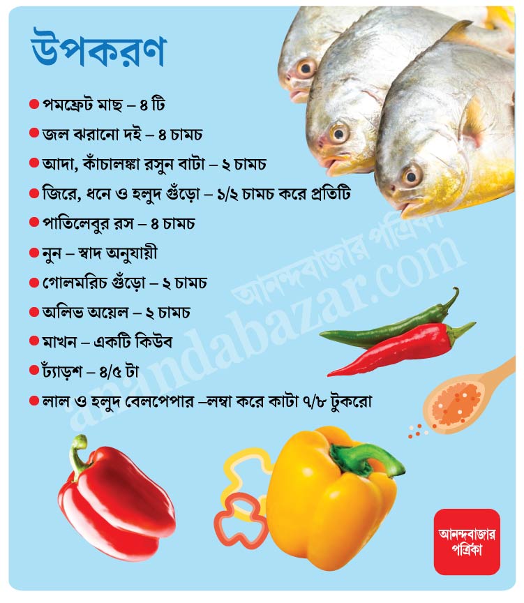 ধনে ,জিরে,রসুন, কাঁচা লঙ্কা আর দইয়ের সঙ্গতে পমফ্রেটের স্বাদে এক নতুন মাত্রা যোগ হয়েছে। যাঁরা সবজি দেখলে নাক কুঁচকে থাকেন, তাঁরাও চারগ্রিলড পমফ্রেটের সঙ্গে ঢ্যাঁড়শ খেতে নারাজ হবেন না। চারগ্রিলড পমফ্রেট উইদ লেডিস ফিঙ্গার অ্যান্ড বেল পেপারসের রেসিপি রইল।