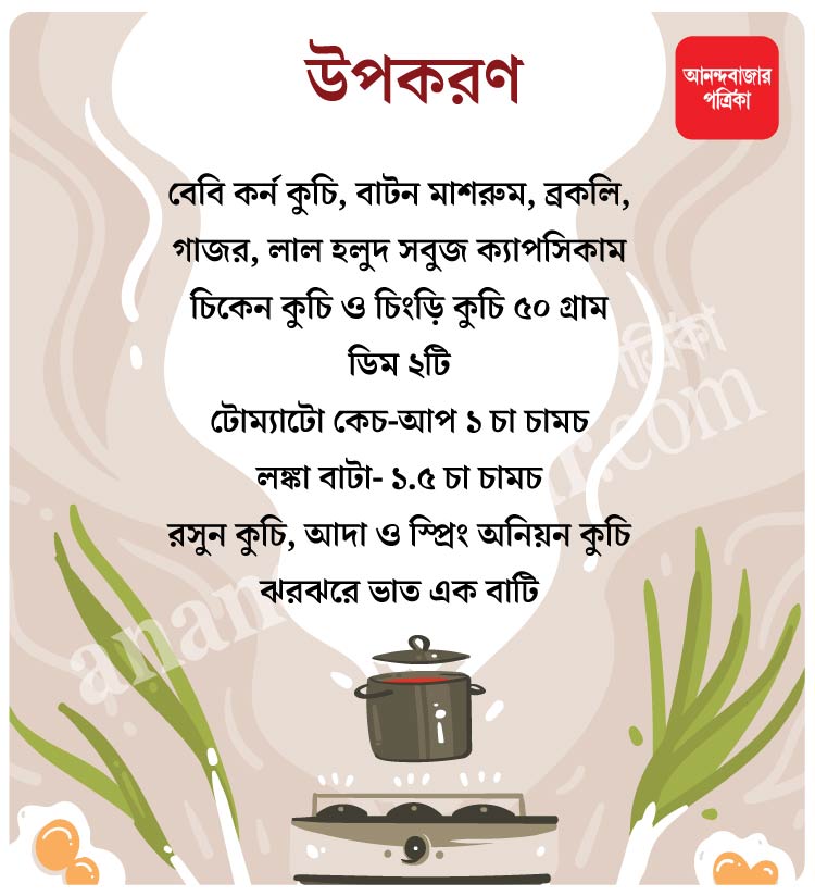 প্রণালী: একটা ওমলেট বানাতে হবে এগ র্যাপের জন্য। একটি ফ্রাইং প্যান বা তাওয়ায় তেল গরম করে তাতে আদা-রসুন কুচি দিয়ে সতে করে নিন। সব্জি যোগ করুন। চিকেন ও চিংড়ি কুচি দিয়ে সাঁতলে নিন আরও কিছুক্ষণ। এর পর ভাত যোগ করুন, টোম্যাটো কেচ-আপ, নুন, গোলমরিচ গুঁড়ো, ব্রথ এবং লঙ্কা বাটা দিয়ে ভাল করে নেড়ে নিন, তবে চালগুলো যেন ভেঙে না যায় সে দিকে খেয়াল রাখতে হবে। এরপর ভাতের র্যাপ হিসেবে ব্যবহার করুন ওমলেটটি। স্প্রিং অনিয়ন ছড়িয়ে পরিবেশন করুন।