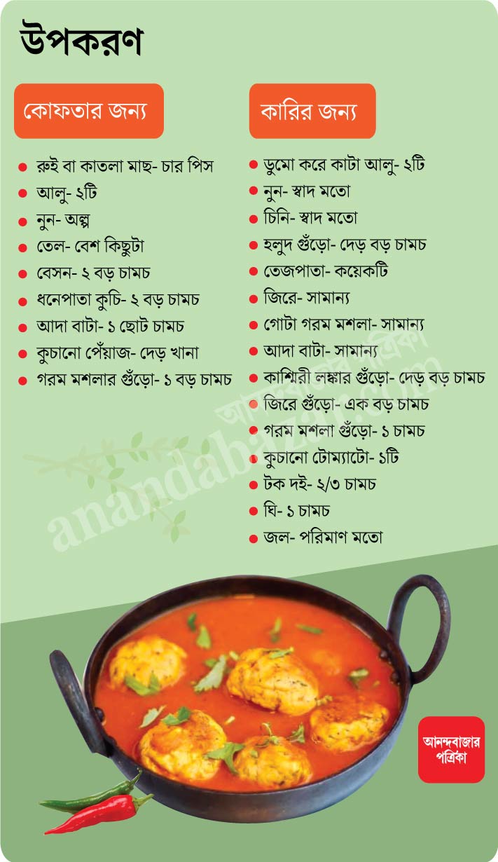 এ বার ওই মিশ্রণ ছোট ছোট বলের আকারে গড়ে নিয়ে ডুবো তেলে সোনালি করে ভেজে তুলে রাখুন। এই পরিমাণ মাখায় প্রায় কুড়ি-বাইশটা কোফতা বল হবে। এ বার কারি-র জন্য ডুমো করে আলু কেটে নুন ও হলুদ দিয়ে ভেজে তুলুন। আবার কড়াই চাপিয়ে তেল গরম করে তেজপাতা, জিরে ও গোটা গরম মশলা (ছোট এলাচ, লবঙ্গ ও দারুচিনি) থেঁতো করে ফোড়ন দিন। সুগন্ধ বেরোলে এ বার তাতে আদা বাটা দিয়ে কাঁচা গন্ধ চলে যাওয়া পর্যন্ত ভাজুন। এক বড় চামচ হলুদ গুঁড়ো, দেড় বড় চামচ কাশ্মিরী লঙ্কার গুঁড়ো ও এক বড় চামচ জিরে গুঁড়ো জলে গুলে দিয়ে নাড়ুন, যতক্ষণ না তেল ছেড়ে দিচ্ছে। এ বার একটি টোম্যাটো কুচি ও দুই তিন চামচ সাদা দই দিন। টোম্যাটো গলে তেল ভাসা অবধি কষান। ভাজা আলু দিন। এ বার পরিমাণ মতো জল, নুন ও অল্প চিনি দিয়ে ফুটতে দিন। এই পর্যায়ে ঝোল একটু বেশি রাখবেন কারণ পরে কোফতা দিলে ঝোল টেনে নেবে। তেল ভেসে ঝোল ঘন হয়ে সুন্দর রঙ এলে এক চামচ ঘি ও এক চামচ গরম মশলা দিন। সব শেষে সাবধানে কোফতাগুলি ঝোলে দিয়ে হাল্কা হাতে নাড়ুন। দেখবেন যেন সেগুলি ভেঙে না যায়। নামিয়ে ভাত বা পোলাওয়ের সাথে পরিবেশন করুন।
