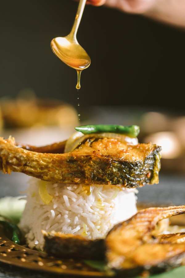 ১. ইংলিশ মাছ ভাজার সময় তার থেকে যে তেল বেরোবে, সেটাকে আলাদা একটা বাটিতে রাখুন।
