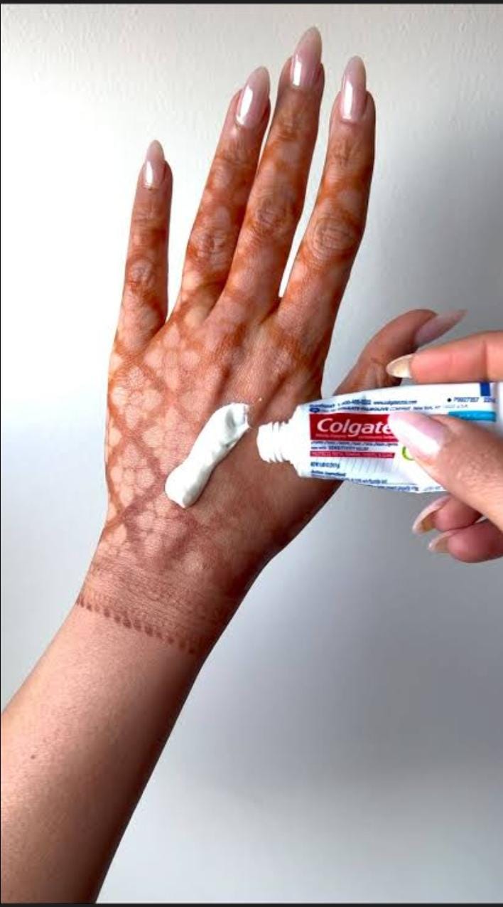 ২। মেহেন্দি তুলতে টুথপেস্টের ভূমিকাও অনবদ্য। প্রথমে হাতের তালুতে বা যে পৃষ্ঠে মেহেন্দি রয়েছে, সেখানে টুথপেস্টের পাতলা স্তর লাগিয়ে রাখুন। এর পর শুকিয়ে গেলে ভেজা কাপড় দিয়ে মুছে নিলেই মেহেন্দি অনেকটাই উঠে যাবে।