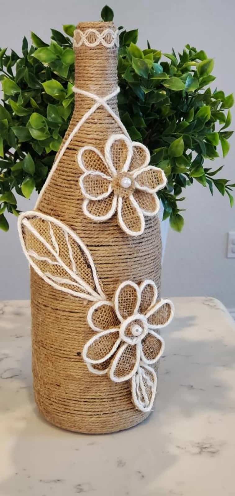 কাচের বোতলের গায়ে মোটা দড়ি বা রঙিন উল জড়িয়ে নিয়ে বানানো যায় নজরকাড়া ফুলদানি। এ ক্ষেত্রে বোতলের গায়ে আঠা লাগিয়ে একদম মুখের কাছ থেকে নীচ পর্যন্ত উল দিয়ে জড়িয়ে নিতে হবে। চাইলে রং দিয়ে গায়ে কিছু কারুকার্যও করা যেতে পারে। এর পরে তাতে ছোট ইন্ডোর প্ল্যান্ট বসিয়ে নিলে মন্দ লাগবে না।