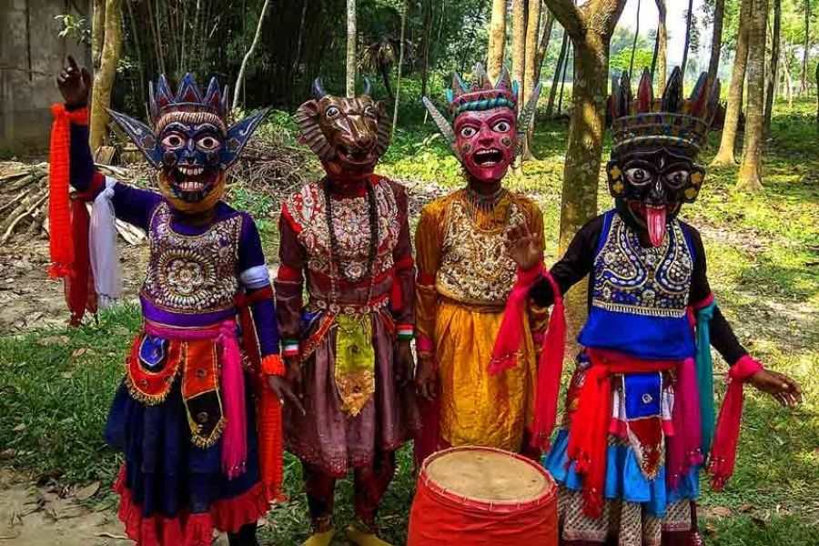 বড় বড় আয়ত চোখ, ঘনঘোর গাত্র বর্ণ, দন্তে সংযত লাল প্রলম্বিত জিহ্বা — মা কালীর মুখোশ। এই মুখোশ পরেই তোলা হবে সিধে, মাঙন। হবে, চণ্ডী নাচ, উড়ান কালী, মাসান কালী, ভদ্রকালীর নৃত্য। তাই এই মুখোশকে সব টুকু নিবেদন আর শ্রম দিয়ে বানান শিল্পী। মুখোশ মূর্তি গড়ার চেয়ে কম কিছু নয়।