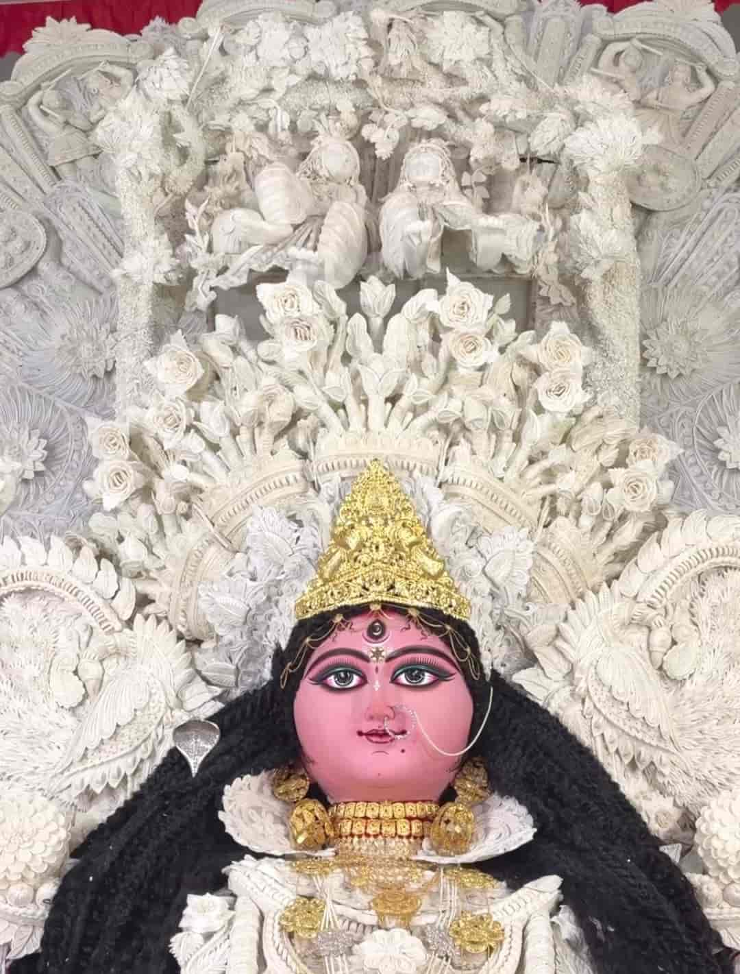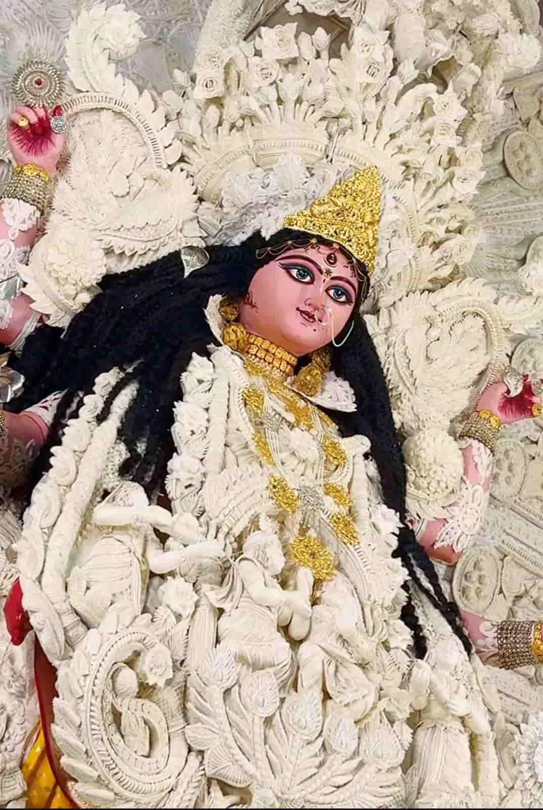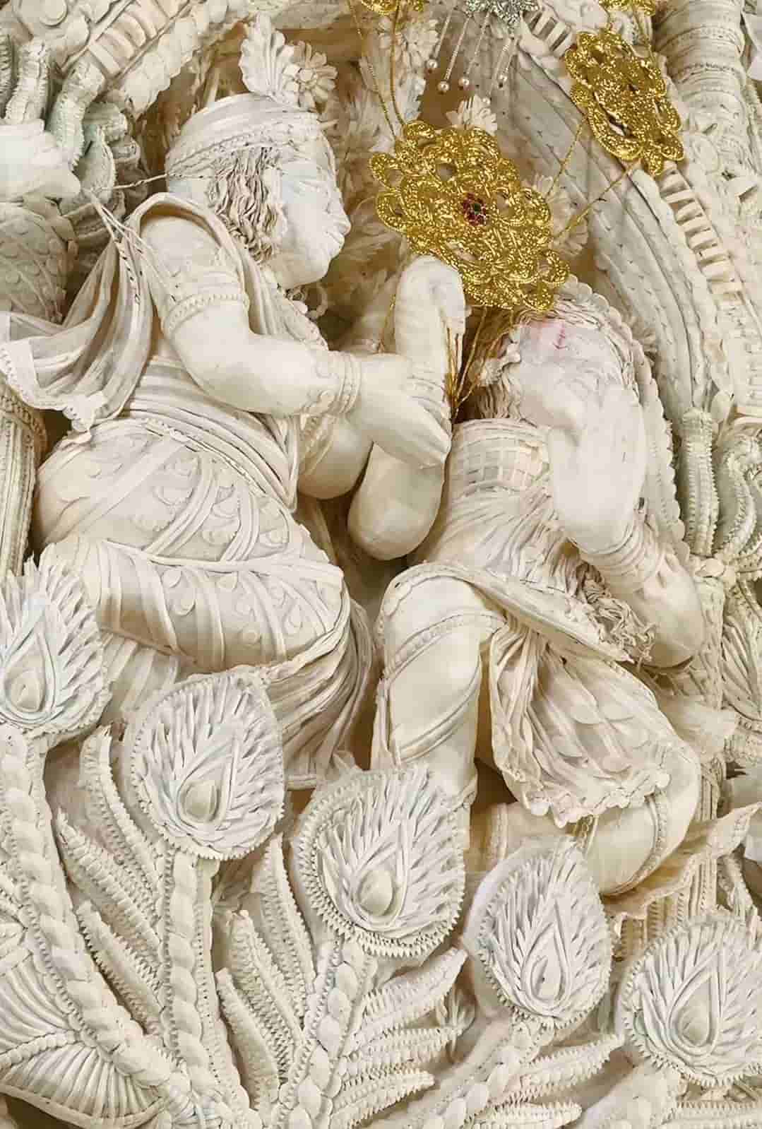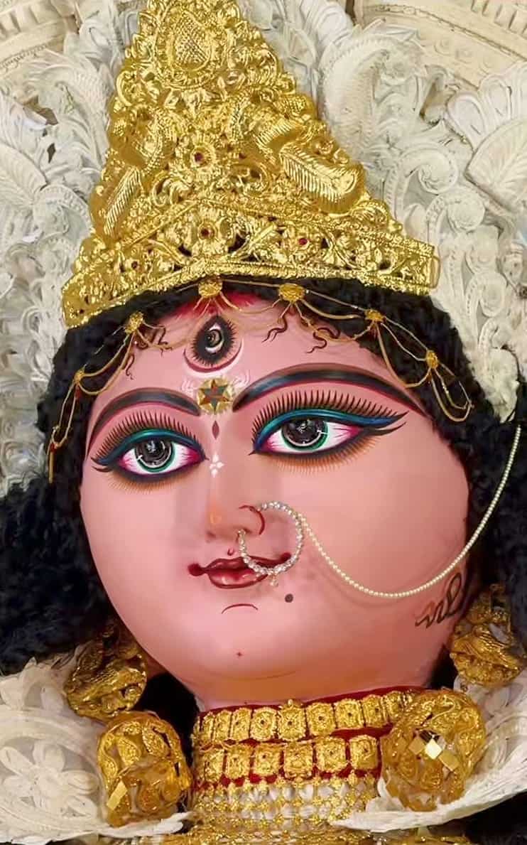 মাতৃ মূর্তির উপরে দোলনায় দুলছে রাধা-কৃষ্ণের মূর্তি, এই গোটা সাজসজ্জা ডাকের সাজেই সেজে উঠেছে। ক্লোজ-শট ভিডিও ফুটেজে প্রতিমার শাড়ির বর্ডার, মুকুট আর হার-দোলনার সূক্ষ্ম কারুকাজ স্পষ্ট দেখা যাচ্ছে।