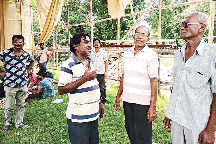পুজো মণ্ডপে শফিক (বাঁ দিকে গোলাপি ডোরা গেঞ্জি)। নিজস্ব চিত্র