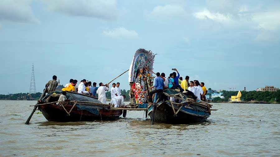 সিঁদুর দান, দর্পণ দর্শনের রীতি সাঙ্গ হতেই ঢাকের তালে বেরিয়ে পড়ে প্রতিমা। ভাসানের যাত্রা যেন শুধু একটা আচার নয়, ইতিহাসের পাতায় লেখা এক জীবন্ত ছবি। ১৭৫৭ সালে রাজা নবকৃষ্ণ দেবের হাত ধরে যে পুজোর শুরু, ভাগ হয়ে গেলেও ছোট রাজবাড়ির প্রথা তার পুরনো চালচিত্র ধরে রেখেছে অত্যন্ত যত্নে। অন্য বাড়ির মতো গঙ্গা তীরে বিসর্জন নয়, ছোট রাজবাড়ির প্রতিমা যাত্রা করে মাঝনদীর দিকে। দুটি নৌকার মাঝে কাঠের পাটাতনে মাকে স্থাপন করা হয়, শুরু হয় এক জলপথের লীলা। গঙ্গাবক্ষে সাতপাক ঘোরেন মা দুর্গা, সেই দৃশ্য দেখতে দশমীর দিনে ঘাটে উপচে পড়ে মানুষের ভিড়। এই সাতপাক যেন দেবী ও তাঁর ভক্তদের মধ্যে শেষ আলিঙ্গন, এর পর পাটাতন সরিয়ে নিতেই প্রতিমা জলে পড়ে।