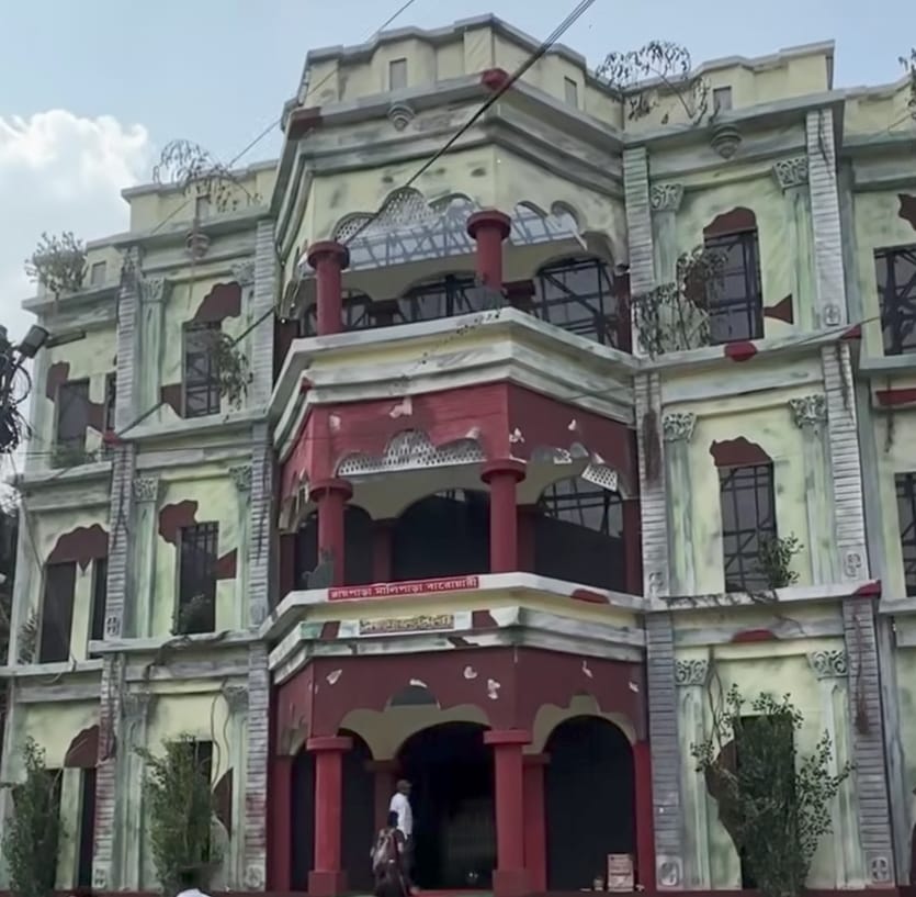 পুজো মানেই তো নতুন কিছু দেখার উত্তেজনা! চেনা ছকে বাঁকা পথে হেঁটে চমকে দেওয়ার সাহস। এ বার সেই চমকের বারুদ নিয়ে হাজির হয়েছে কৃষ্ণনগরের রায়পাড়া মালিপাড়া বারোয়ারী। রাজবাড়ির শহর, তাই থিমে রাজবাড়ির ছায়া থাকা অস্বাভাবিক নয়। কিন্তু এ কী! কৃষ্ণনগর রাজবাড়ীর কাছেই তৈরি হওয়া এই মণ্ডপটি বাইরে থেকে দেখলে তাকে মণ্ডপ বলে ঠাহর করা কঠিন। রাজবাড়ির থিম এখানে অন্য রূপে ধরা দিয়েছে – সেজে উঠেছে 'হানা বাড়ি'র বেশে।