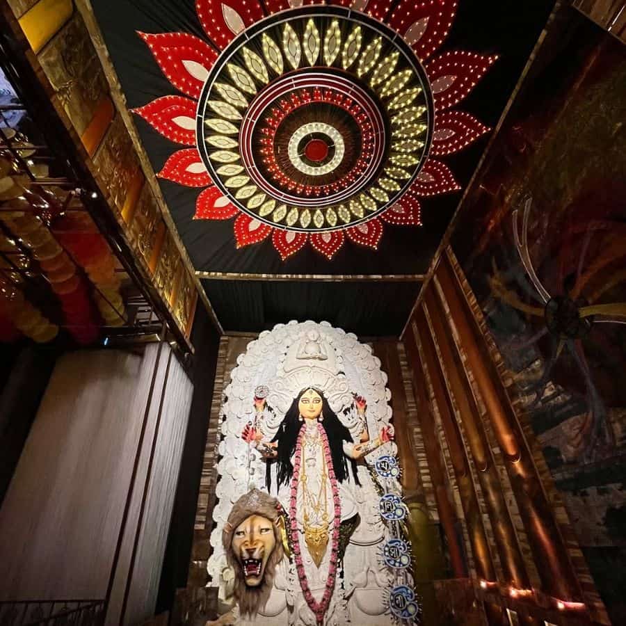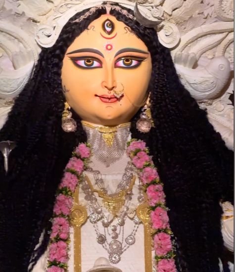 চন্দননগরের জগদ্ধাত্রী পুজো মানেই যে কেবল চোখ ধাঁধানো আলোকসজ্জা আর থিমের নানা বাহার, সেই ধারণা এ বার কিছুটা হলেও পাল্টেছে। বিগত কয়েক বছর ধরেই দেখা যাচ্ছে প্রতিমার শোলার সাজসজ্জাতেও থিমের বৈচিত্র্য। এই বছর সেই শোলার কারুকার্যই মূল আকর্ষণ খলিসানি সর্বজনীনের। সুবিশাল দেবী প্রতিমা এ বার সেজে উঠছে সম্পূর্ণ শোলার গয়নায়। শিল্পী আকাশ পাল-এর নিপুণ হাতের জাদুতে দেবী-সাজে ফুটে উঠেছে ‘আমাদের পৃথিবী’র প্রতিচ্ছবি। শোলার ফ্রেমে যখন পৃথিবীর ছবি জীবন্ত হয়ে ওঠে, তখন দেবী যেন আরও বেশি করে ঘরের মানুষ হয়ে ওঠেন। মণ্ডপসজ্জায় দেখা গেছে মোনালিসার একটি সুবিশাল ছবি, পাশেই রয়েছে কুচিপুড়ি নর্তকীর ছবি। এই অভিনব ভাবনার বুনন দর্শককে শুধু আনন্দই দেবে না, একই সাথে এক মানবিক বার্তা দেবে। ইতিমধ্যেই পুজোপ্রেমী মানুষজন দেবী দর্শন করে ফেলেছেন।