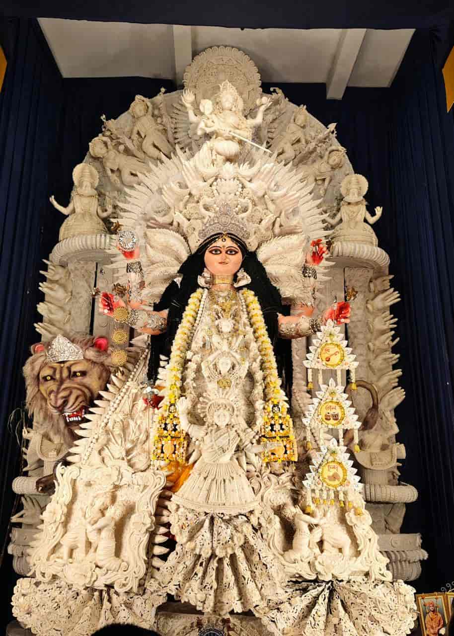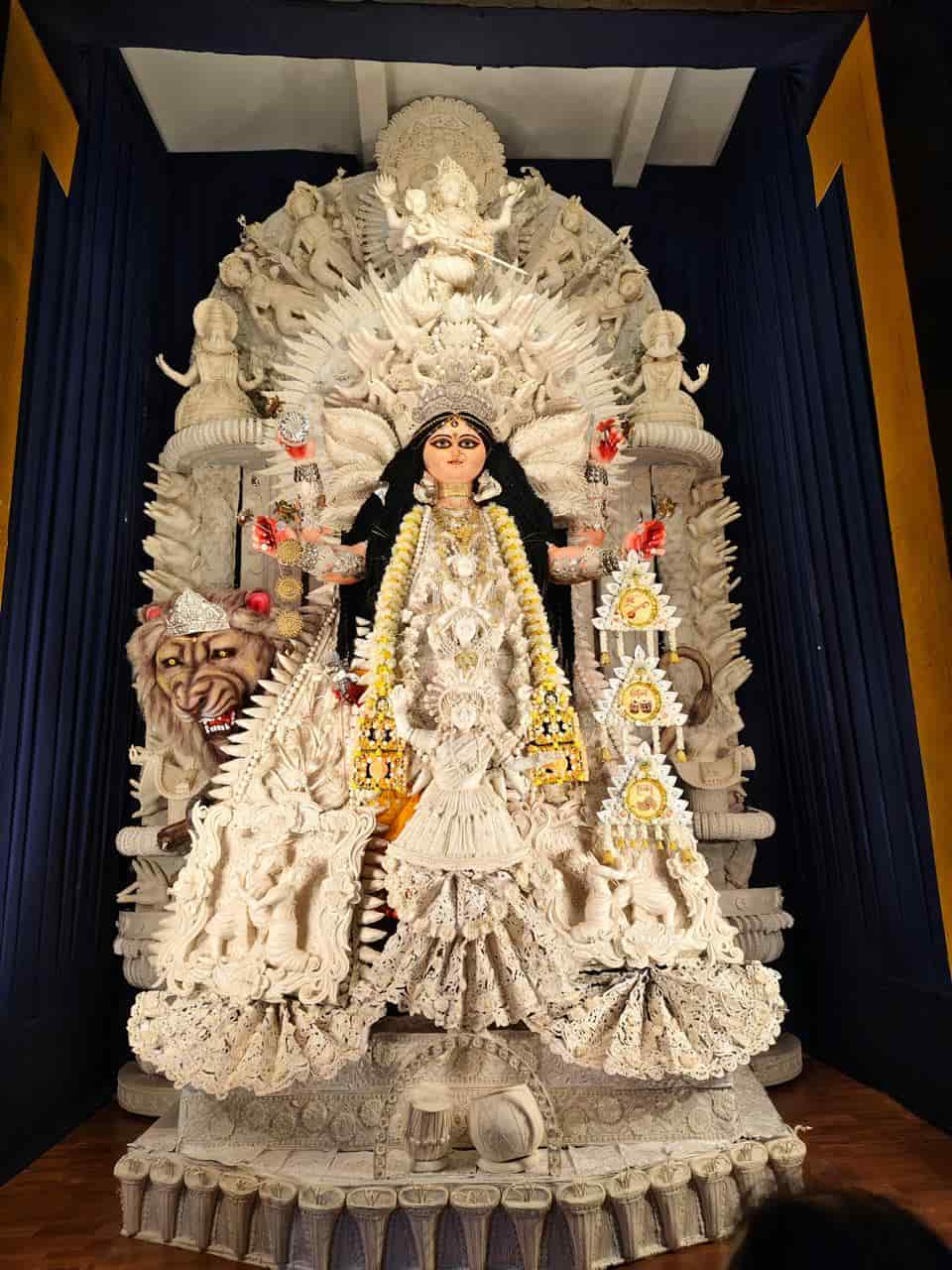 মণ্ডপে ঢুকলেই মন চলে যাবে এক প্রাচীন পাঠশালার আবহে। এ যেন এক বিশাল গ্রন্থালয়! মণ্ডপসজ্জায় অজস্র বইয়ের ব্যবহার, পুরনো ছাপাখানার যন্ত্রপাতির উপস্থিতি—সব মিলিয়ে এক অন্য স্বাদের পরিবেশ। এখানকার শিল্পকর্ম যেন নীরবে কিছু বলতে চায়, স্মৃতির সুতোয় বেঁধে দেয় মনকে। কারিগর মহাদেব পাল ও আকাশ পালের হাতের ছোঁয়ায় দেবী এখানে সুউচ্চ, হলুদ শাড়িতে ডাকের সাজে অপরূপা। দেবীর মাথার উপরে স্থান পেয়েছেন স্বয়ং দেবাদিদেব মহাদেব। এমন শৈল্পিক বুনন আর ভক্তির এমন যুগলবন্দি সত্যি বিরল।