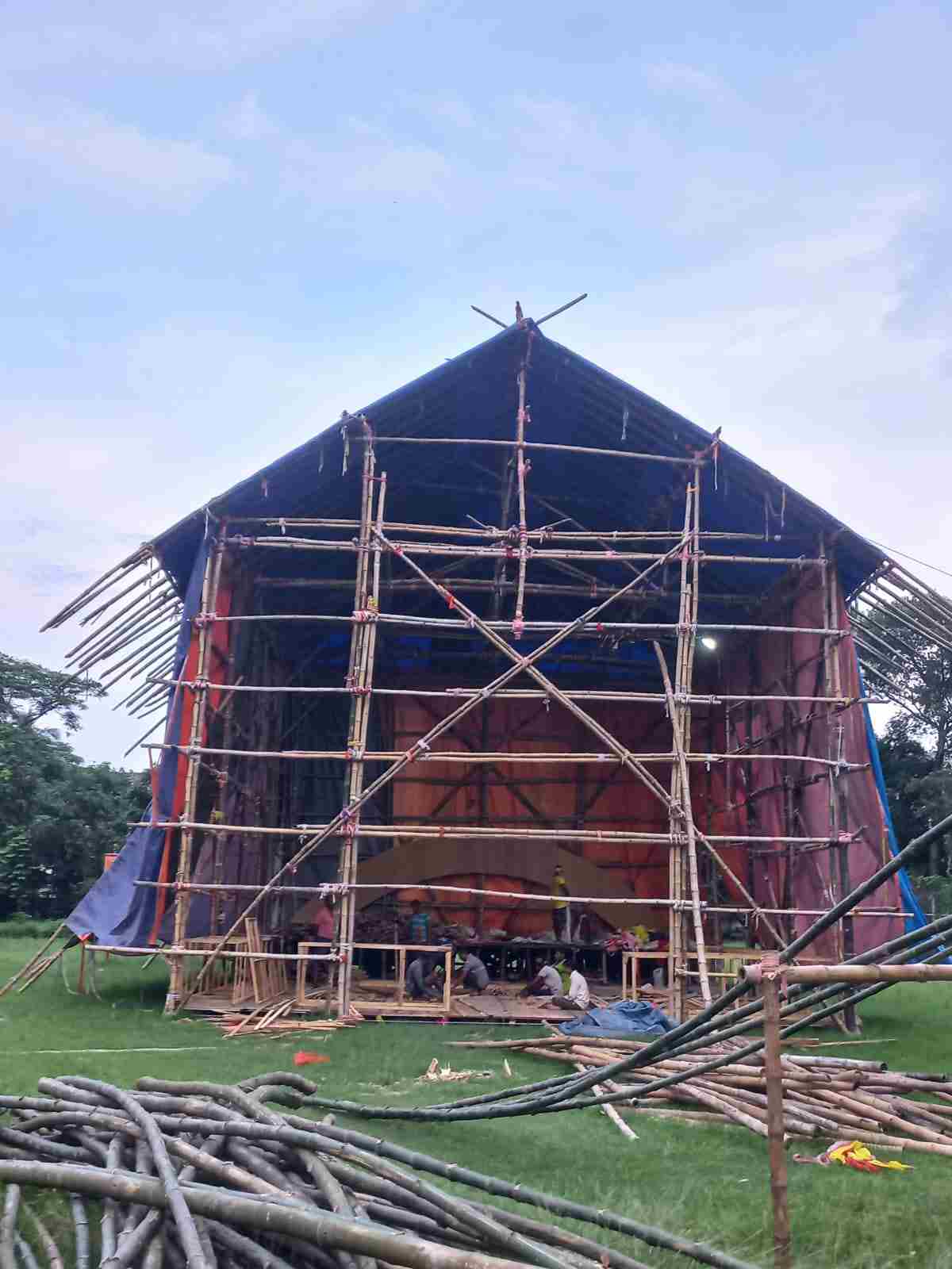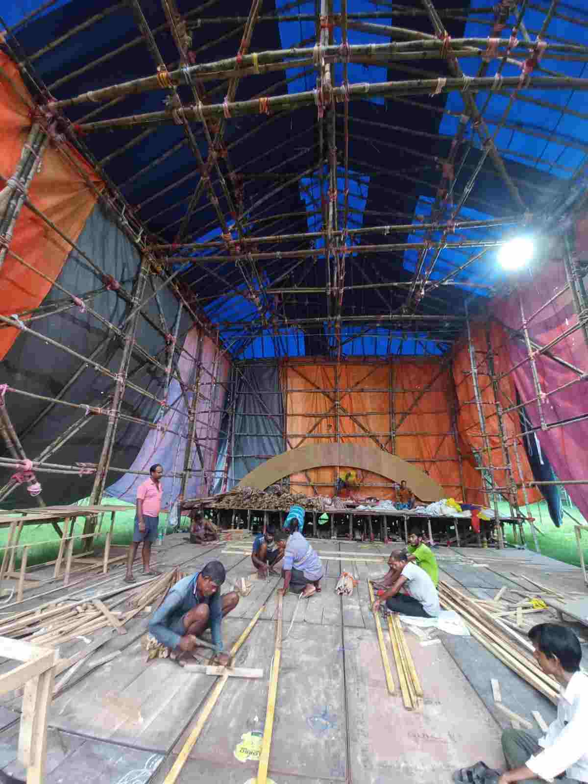 মন্ডপ সাজানোর জন্য বিভিন্ন চিত্রপট তৈরি করা হচ্ছে। বেশিরভাগ বড় পুজো থিমের দিকে সরে যাচ্ছে শুধু মণ্ডপ নয়, প্রতিমাতেও বদল আনা হচ্ছে। ঠিক সেই জায়গা থেকে এই সর্বজনীনের ভাবনা বাঙালিয়ানার সনাতনী জায়গাটিকে তুলে ধরা। নাম দেওয়া হয়েছে বাঙালিয়ানা বনেদিয়ানা সবেকিয়ানা, সব এক সঙ্গে এক চালাতেই!