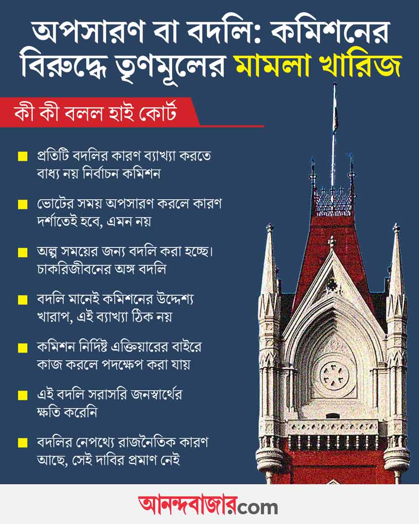 ৫) হাই কোর্ট বলছে, অনেক আধিকারিকের বদলি হয়েছে মানেই তাতে কমিশনের ‘খারাপ উদ্দেশ্য’ রয়েছে এটা বলা যাবে না। সারা দেশেই ভোটের সময় একই ভাবে কমবেশি বদলি করা হয়েছে।