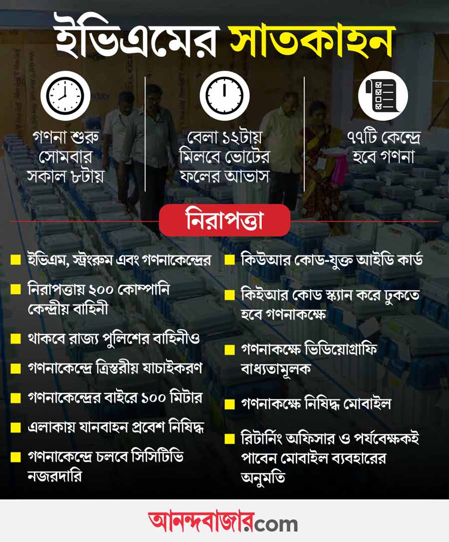 গণনাকেন্দ্রে থাকছে ত্রিস্তরীয় নিরাপত্তা ব্যবস্থা। গণনাকেন্দ্রের বাইরে ১০০ মিটার এলাকায় কোনও যানবাহন প্রবেশ করতে পারবে না। সেখানকার নিরাপত্তায় থাকছে রাজ্যের সশস্ত্র পুলিশ বাহিনী। গণনাকেন্দ্রে প্রবেশ এবং গণনাকক্ষের মধ্যেকার অংশ থাকবে পুলিশ এবং কেন্দ্রীয় বাহিনীর দখলে। তল্লাশির পরেই ভিতরে যাওয়ার অনুমতি মিলবে। মোবাইল, অস্ত্র ইত্যাদি জমা রাখতে হবে। গণনাকক্ষের নিরাপত্তার দায়িত্বে থাকবে কেন্দ্রীয় বাহিনী।