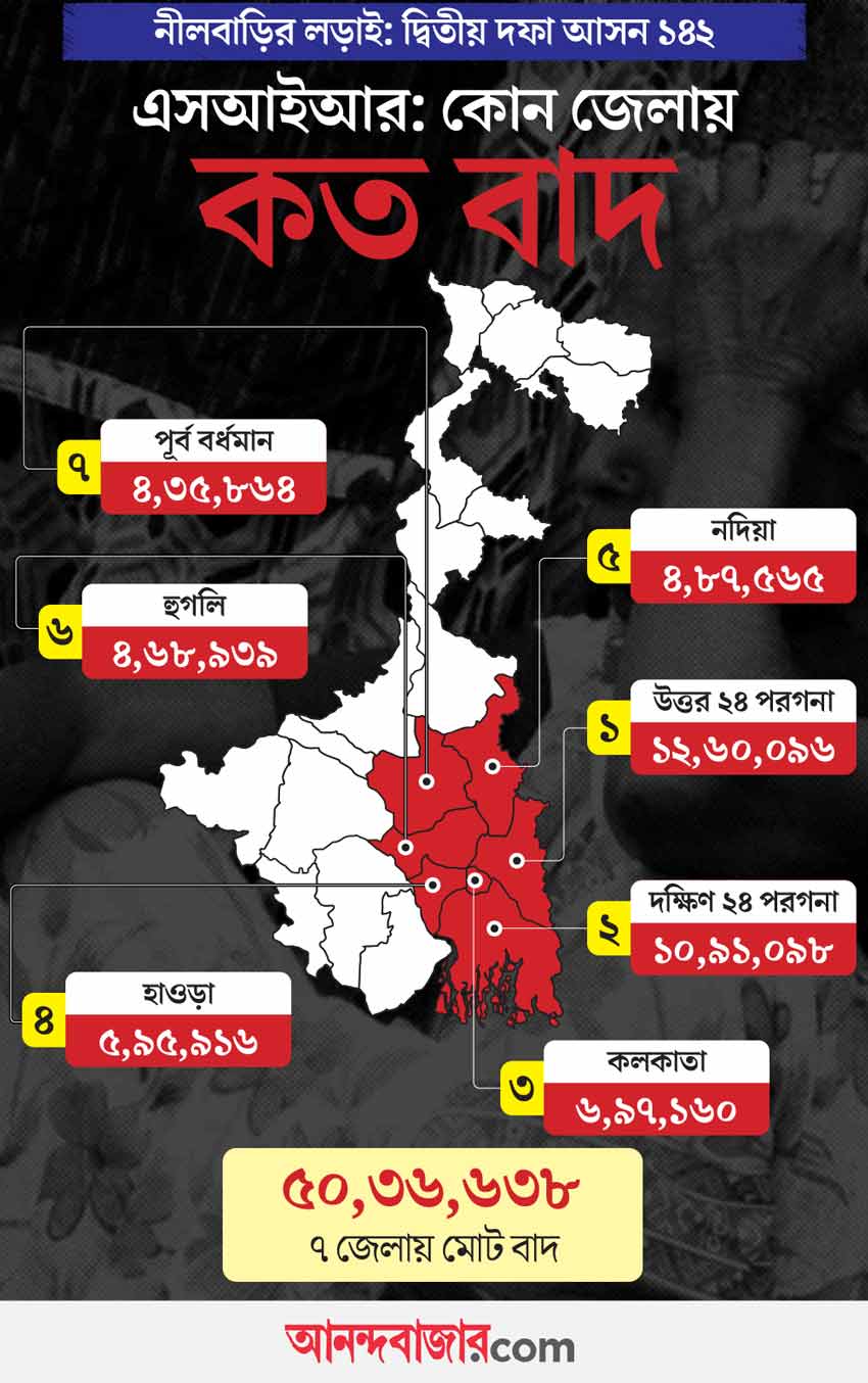 প্রথম দফায় ১৫২টি আসনে ভোটগ্রহণ হয়েছিল। ১৬টি জেলায় বিস্তৃত সেই ১৫২টি আসনে এসআইআর-এর ফলে নাম বাদ গিয়েছে ৪০ লক্ষ ৪৬ হাজার। দ্বিতীয় দফায় জেলার সংখ্যা ৭টি। আসন সংখ্যা ১৪২। অর্থাৎ প্রথম দফার থেকে ১০টি কম। কিন্তু এই ১৪২ কেন্দ্রে এসআইআর-এর ফলে নাম বাদ পড়েছে ৫০ লক্ষ ৩৬ হাজার। তার মধ্যে দুই ২৪ পরগনার ৬৪টি আসনেই নাম বাদ প়ড়েছে প্রায় ২৩ লক্ষ। এ বারের ভোটে এসআইআর-এর ফলে নাম বাদ যাওয়া ফলাফলের ক্ষেত্রে অন্যতম সূচক হতে চলেছে বলে অনেকেরই অভিমত। সে দিক থেকে দ্বিতীয় দফার ভোট প্রথম দফার থেকেও তৃণমূলের কাছে বেশি ‘তাৎপর্যপূর্ণ’।