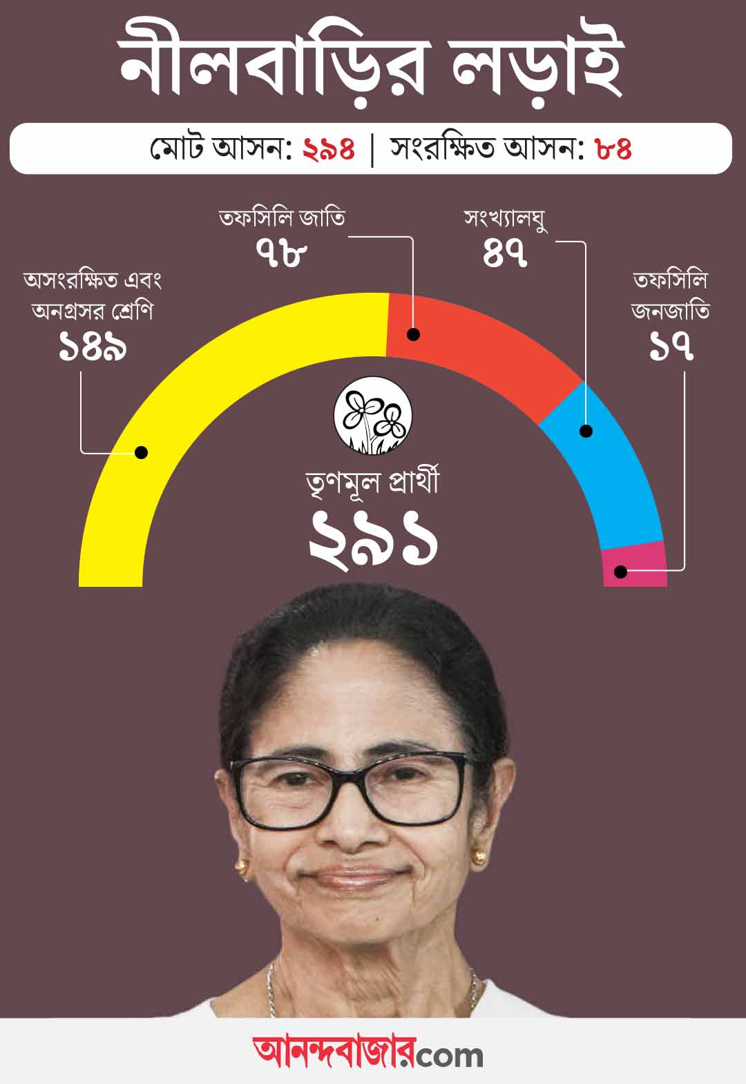 রাজ্যে মোট বিধানসভা কেন্দ্রের সংখ্যা হল ২৯৪। তার মধ্যে তফসিলি জাতির জন্য ৬৮টি এবং তফসিলি জনজাতির জন্য ১৬টি সংরক্ষিত আসন রয়েছে। চলতি বিধানসভা ভোটে তৃণমূল ২৯১টি আসনে প্রার্থী দিয়েছে। পাহাড়ের তিনটি আসনে প্রার্থী দিচ্ছেন অনীত থাপার দল ‘ভারতীয় গোর্খা প্রজাতান্ত্রিক মোর্চা’। সংরক্ষিত আসন ছাড়া অসংরক্ষিত আসনেও ১০ জন তফসিলি জাতি এবং এক জন তফসিলি জনজাতির প্রতিনিধিকে প্রার্থী করেছে তৃণমূল। কেন এমন করা হল?