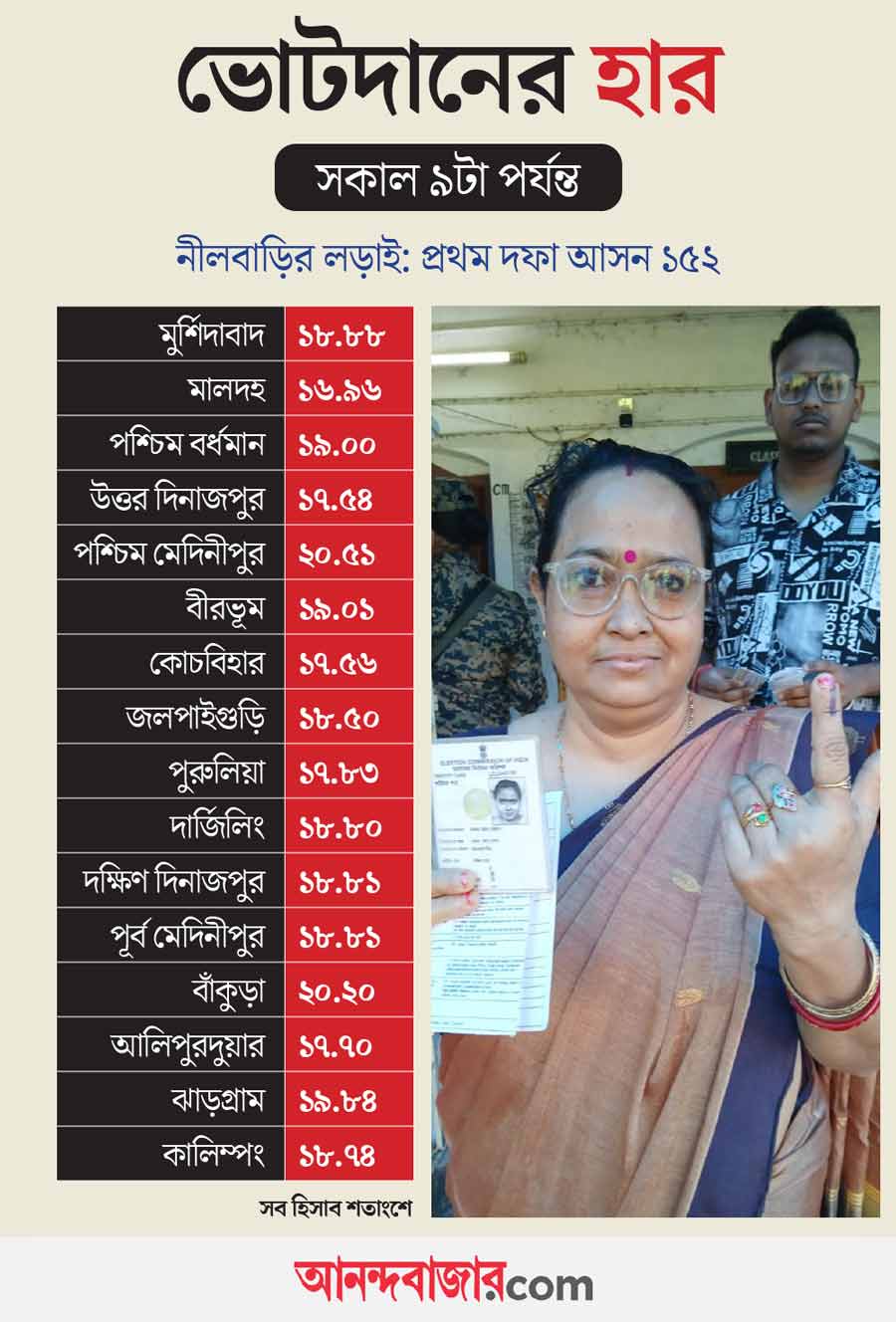 সকাল ৭টা থেকে ৯টা পর্যন্ত পশ্চিমবঙ্গে ভোট পড়েছে ১৮.৭৬ শতাংশ।
