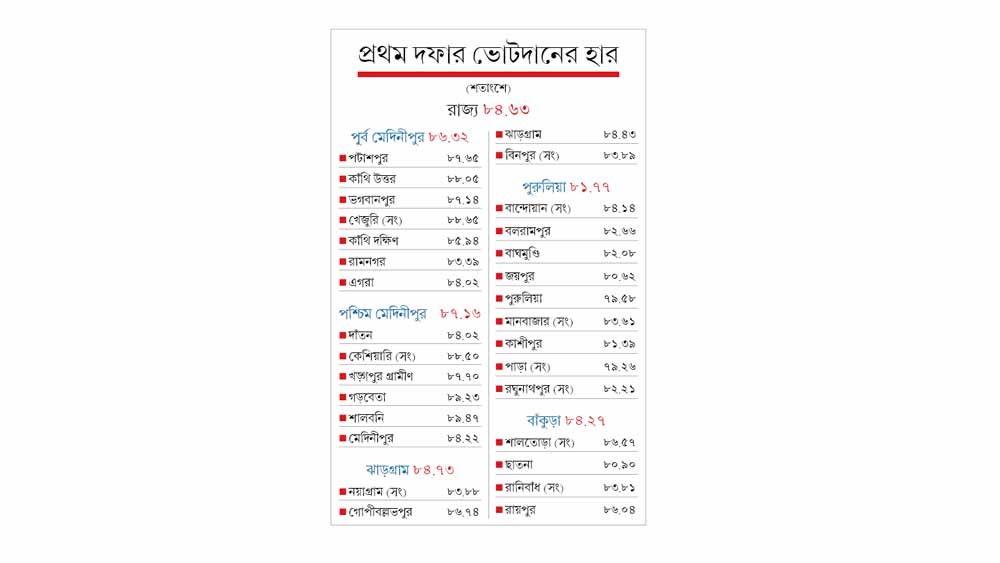 শনিবার প্রথম দফার নির্বাচন হয়ে গিয়েছে। ওই দিন সর্বশেষ বিকেল পাঁচটা পর্যন্ত ভোটদানের হার প্রকাশ করতে পেরেছিল কমিশন। রবিবার পূর্ণাঙ্গ হার প্রকাশ করা হয়েছে। কমিশনের তথ্য অনুযায়ী, শনিবার সন্ধ্যা সাড়ে ছ’টা পর্যন্ত প্রথম দফায় সব মিলিয়ে ভোট পড়ার হার ৮৪.৬৩ শতাংশ। এর মধ্যে বাঁকুড়ায় ৮৪.২৭, ঝাড়গ্রামে ৮৪.৭৩, পশ্চিম মেদিনীপুরে ৮৭.১৬, পূর্ব মেদিনীপুরে ৮৬.৩২ এবং পুরুলিয়ায় ৮১.৭৭ শতাংশ ভোট পড়েছে।