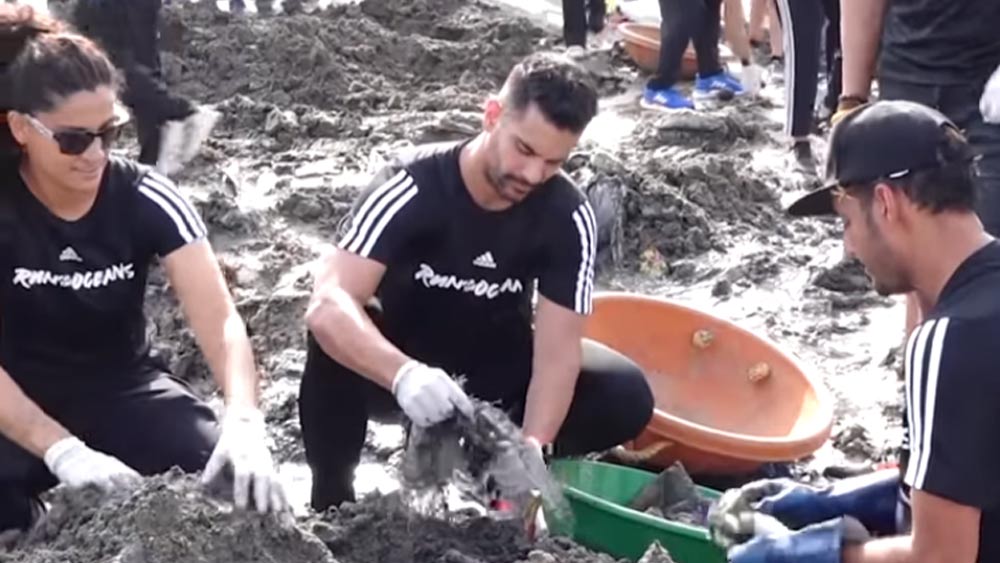 প্রথমে মনে হয়েছিল কোনও ছবির শ্যুটিং চলছে। ব্যাপারটা আদৌ তা নয়। ভিডিয়োটি একটি পোশাক প্রস্তুত সংস্থার ‘পরিবেশ রক্ষা ও প্লাস্টিক বর্জন’ অনুষ্ঠানের। এই ভিডিয়ো সাড়া ফেলেছে নেটমাধ্যমে। রোজ সকালে শরীর জন্য জিমে যাওয়ার বদলে অভিনেতারা পৌঁছে গেলেন জুহু বিচে। কেউ আবার সকালে ঠিক সময়ে পৌঁছনোর জন্য রাত জেগে নেটমাধ্যমে পোস্ট, রিল করা বন্ধ রেখে ঘুমিয়ে পড়েছেন ১০ টার মধ্যে। কালো টি-শার্ট, কালো ট্র্যাক, হাতে গ্লাভস পরে কাদাজল ঘেঁটে গামলা করে মাটি তুলছেন। কেউ আবার নোংরা থেকে তুলে আনছেন প্লাস্টিক।