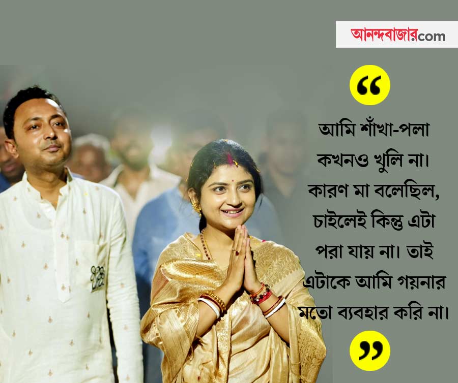 ভোট মানে যেমন ব্যস্ততা, কড়া রোদে ঘাম ঝরানো জনসংযোগ, তেমনই তার সঙ্গে জুড়ে থাকে ফ্যাশনও। ভোটপ্রার্থীদের অনেকেরই অনেক ধরনের ‘স্টাইল স্টেটমেন্ট’ রয়েছে। তবে অদিতি জানান, ফ্যাশনে মনোযোগ দেওয়ার মতো তাঁর সময় নেই। ভোটপ্রচার করে, ছোট বাচ্চাকে সামলে আর ফ্যাশন বা নিজের পরিচর্যা করতে পারেন না। অদিতির কথায়, ‘‘আমি সুতির শাড়ি পরতে ভালবাসি, সেটা পরেই চলছে প্রচার। আর মাঝেমধ্যে একটু সময় পেলে সে দিনটা একটু লিপস্টিক পরলাম, অল্প সানস্ক্রিন ক্রিম। চুলটা ভাল ভাবে বাঁধলাম— এই আর কী! আর আমি শাঁখা-পলা কখনও খুলি না। কারণ মা বলেছিল, চাইলে যখন খুশি কিন্তু এটা পরা যায় না। তাই এটাকে আমি গয়নার মতো ব্যবহার করি না। এ ছাড়াও আমি খুব সেকেলে। ভোটের সময় প্রচার করব, না কি ফ্যাশন করব!’’