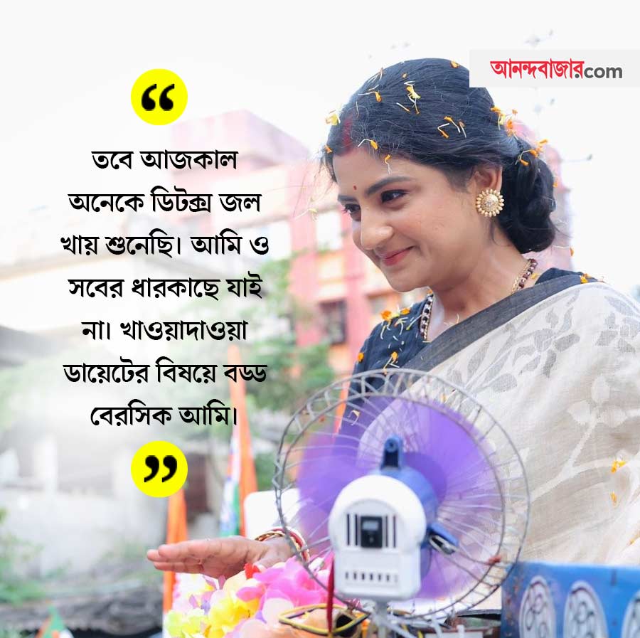 তবে অদিতি খুব একটা ডায়েট মেনে চলা মানুষ নন। সন্তানের জন্মের আগেও যেমন কোনও ডায়েট মানেননি, পরেও যে খুব মানছেন, তেমন নয়। অদিতির কথায়, ‘‘আমার ওজন সে ভাবে বাড়েনি। আমি বাড়ি থেকে রুটি-তরকারি খেয়ে বেরোই, তাড়া থাকলে সেটাও খাই না, শুধু চা-বিস্কুট। প্রচারের পরে বাড়ি ফিরে একটু ডাল-ভাত। সন্ধের পর থেকে প্রচুর জল খাই। এ ছাড়াও আমি চা খেতে ভালবাসি। লাল চা, চিনি ছাড়া। সেটা প্রচুর বার খাওয়া হয়। এতে জলও ঢোকে শরীরে। তবে আজকাল অনেকে ডিটক্স জল খায় শুনেছি। আমি ও সবের ধারকাছে যাই না। খাওয়াদাওয়া ডায়েটের বিষয়ে বড্ড বেরসিক আমি।’’