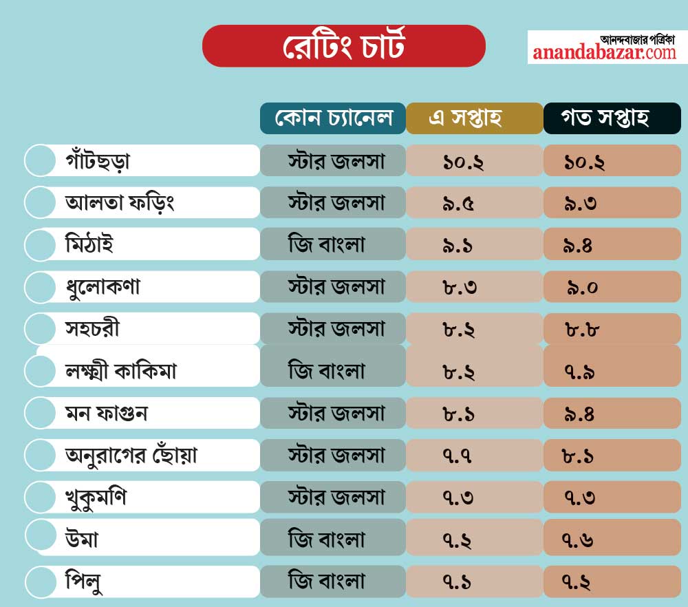 নিষ্ঠার সঙ্গে শিবরাত্রি পালন করেছে খড়ি-ঋদ্ধিমান। ফলাফল? চলতি সপ্তাহেও ‘মিঠাই’কে পিছনে ফেলে প্রথম স্টার জলসার ‘গাঁটছড়া’। শুধু ‘বাংলা সেরা’ হয়েই থেমে থাকেনি খড়ি। ফাঁস করেছে বড়দি দ্যুতি আর ঋদ্ধিমানের ভাই রাহুলের কীর্তিকলাপ। যার জন্য বিয়ের পিঁড়ি থেকে উঠে বাড়ি ছেড়েছিল সে। এ বার কি ঋদ্ধিমানের আস্তে আস্তে বুঝবে খড়িকে? এই কৌতূহল ধারাবাহিকের সামনে বসিয়ে রেখেছে দর্শকদের। যার দৌলতে ১০.২ নম্বর ‘গাঁটছড়া’র ঝুলিতে। ৯.৫ পেয়ে দ্বিতীয় ‘আলতা ফড়িং’। এই সপ্তাহে তৃতীয় স্থানে ‘মিঠাই’। প্রাপ্ত নম্বর ৯.১। অনুরাগীদের দাবি, মিঠাই-সিদ্ধার্থের ভোল বদল, পাহাড়ে মধুচন্দ্রিমা ছাপ ফেলেছে দর্শকমনে। জি বাংলার ৪৬ সপ্তাহের সেরা ধারাবাহিকও তাই একটু একটু করে ফের সামনে এগিয়ে আসছে।