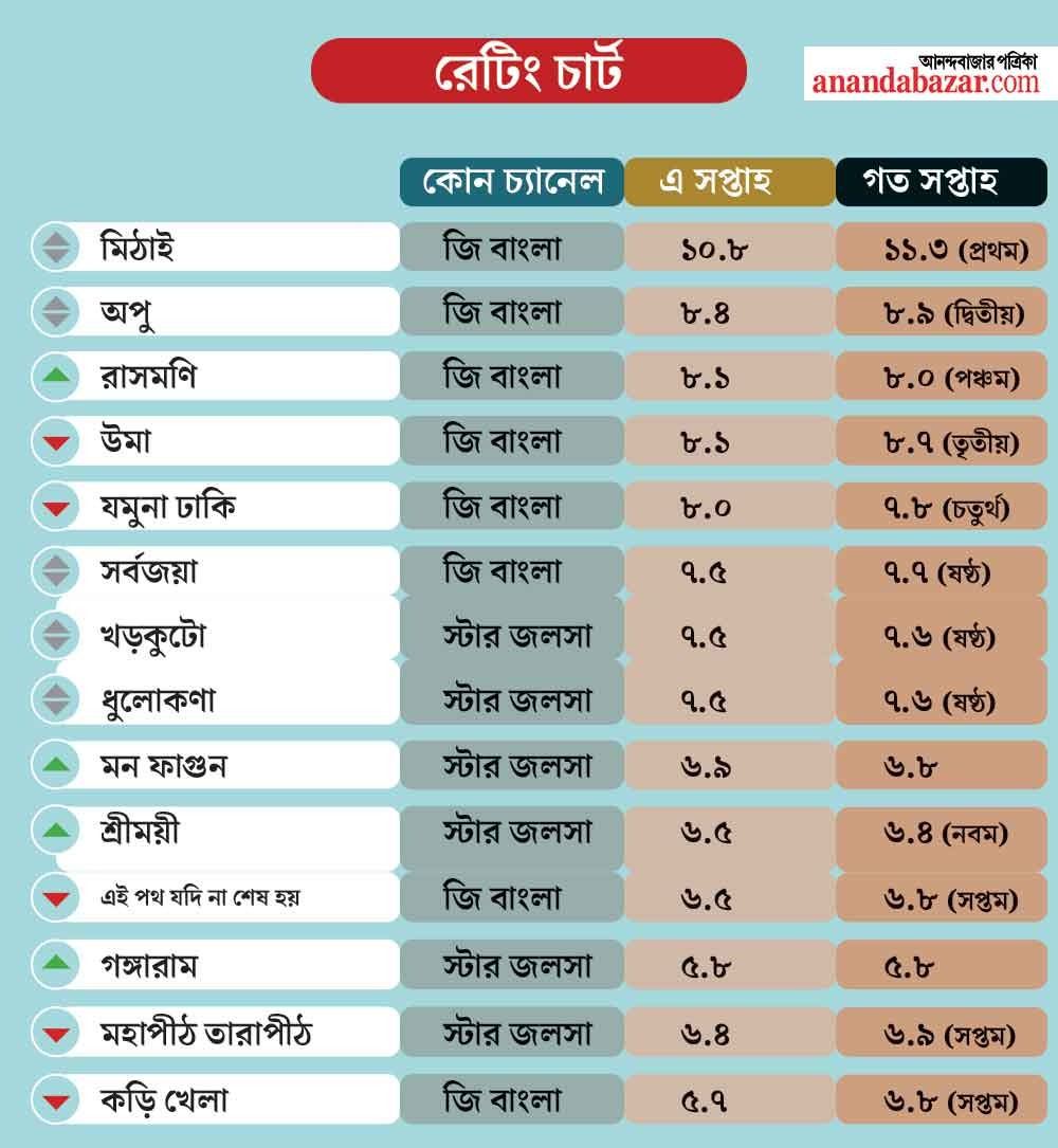 হাড্ডাহাড্ডি লড়াই চলছে ‘অপরাজিতা অপু’, ‘উমা’, ‘যমুনা ঢাকি’, ‘রাণী রাসমণি’ আর ‘সর্বজয়া’র মধ্যে। ‘সর্বজয়া’র মতোই ‘উমা’ও প্রথম থেকেই রেটিং চার্টে ভাল জায়গা করে নিয়েছে। এই পাঁচ ধারাবাহিকের মধ্যে ৮.৪ পেয়ে দ্বিতীয় ‘অপরাজিতা অপু’। ৮.১ পেয়ে যুগ্ম ভাবে তৃতীয় ‘রাণী রাসমণি’ আর ‘উমা’। ৮.০ পেয়ে ‘যমুনা ঢাকি’ চতুর্থ। সর্বজয়া ৭.৫ পেয়ে পঞ্চম স্থানে। একই নম্বর পেয়ে তার সঙ্গে জায়গা ভাগ করে নিয়েছে ‘খড়কুটো’ আর ‘ধুলোকণা’।
