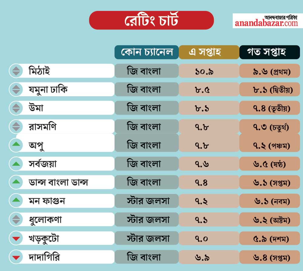 ধারাবাহিক ‘মিঠাই’-এর প্রতিদ্বন্দ্বী আপাতত ‘মিঠাই’ নিজেই। তাকে টপকে যাওয়ার সাধ্য আপাতত বাকি কোনও ধারাবাহিকের নেই। কোনও সপ্তাহে নম্বর কমলে পরের সপ্তাহেই সেই খামতি পূরণ করে নিচ্ছে ‘মিঠাই’। গত সপ্তাহে যেমন তার প্রাপ্ত নম্বর ছিল ৯.৬। এ বারেই তা বেড়ে ১০.৯। পাশাপাশি, এ সপ্তাহেও রেটিং তালিকার প্রথম ছ’টি আসন জি বাংলা-র দখলে।