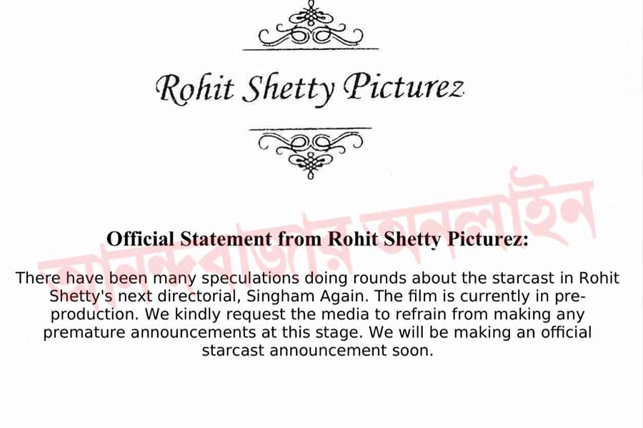 এ দিকে তাঁর ছবিতে ভিকির উপস্থিতি নিয়ে গুজব ছড়াতেই মঙ্গলবার রোহিতের প্রযোজনা সংস্থার তরফে একটি বিবৃতি প্রকাশ করা হয়। সেই বিবৃতিতে লেখা হয়েছে, ‘‘রোহিত শেট্টির পরিচালিত সিংহম এগেন নিয়ে একাধিক গুজব ছড়িয়েছে। ছবিটি আপাতত প্রস্তুটি পর্বে রয়েছে। আমরা সবাইকে অনুরোধ করছি, দয়া করে কোনও রকম আগাম ঘোষণা করবেন না। আমরা খুব দ্রুত ছবির অভিনেতাদের নাম আনুষ্ঠানিক ঘোষণা করব।’’