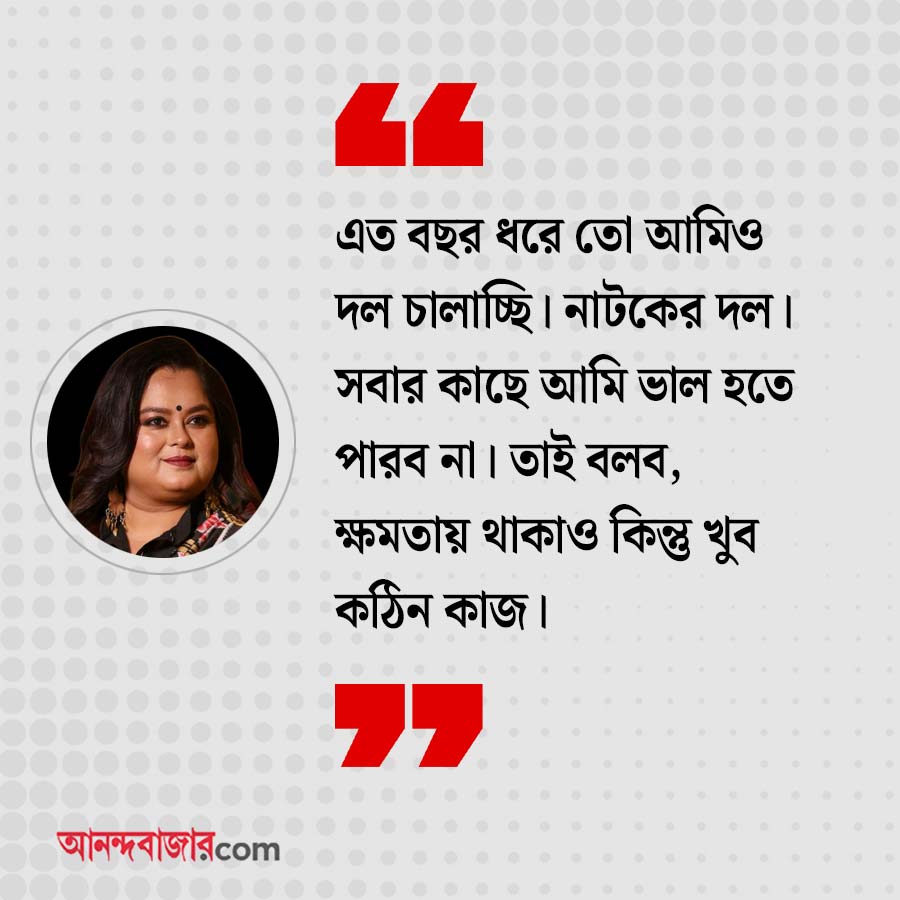 সোহিনী: কখনওই নিজেকে ওই জায়গায় দেখতে চাই না। কাল্পনিক জগতেও নিজেকে বিধায়ক হিসেবে, বা ক্ষমতাসীন হতে দেখতে চাই না। অবশ্যই বদল চাই, পৃথিবীতে শান্তি চাই, কিন্তু আমি সেই বদল ঘটানোর মতো ক্ষমতা রাখি না। তবে এত বছর ধরে তো আমিও দল চালাচ্ছি। নাটকের দল। সবার কাছে আমি ভাল হতে পারব না। তাই বলব, ক্ষমতায় থাকাও কিন্তু খুব কঠিন কাজ।