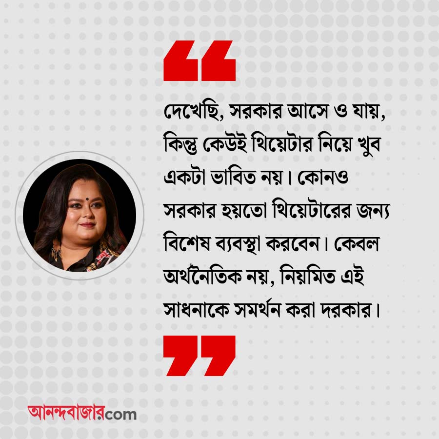 সোহিনী: ছোট থেকেই থিয়েটারের পেশায় রয়েছি। দেখেছি, সরকার আসে ও যায়, কিন্তু কেউই থিয়েটার নিয়ে খুব একটা ভাবিত নয়। কোনও সরকার হয়তো থিয়েটারের জন্য বিশেষ ব্যবস্থা করবেন। কেবল অর্থনৈতিক নয়, নিয়মিত এই সাধনাকে সমর্থন করা দরকার। আসলে থিয়েটার যে ভাবে মননশীল মানুষ তৈরি করে, তাতে বোধ হয় সব সরকারই ভয় পায়। সব সরকারই ভাবে, আমরা হয়তো বেশি প্রশ্ন করব। তাই ডানায় হাওয়া দেওয়ায় এত অনীহা সরকারের। কিন্তু ভয় পাওয়ার কিছু নেই, থিয়েটারকে এগিয়ে দিলে পৃথিবী আরও সুন্দর হবে।