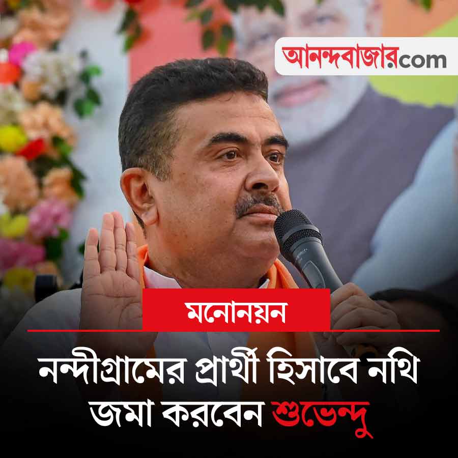 আজ দুপুরে নন্দীগ্রাম বিধানসভা কেন্দ্রে প্রতিদ্বন্দ্বিতার জন্য মনোনয়নপত্র জমা দেবেন শুভেন্দু অধিকারী। হলদিয়ায় এই মনোনয়ন জমা দেবেন তিনি। মনোনয়নপত্র জমার কর্মসূচিতে বিরোধী দলনেতা শুভেন্দুর সঙ্গে থাকবেন দিলীপ ঘোষও। থাকবেন কেন্দ্রীয় মন্ত্রী ধর্মেন্দ্র প্রধান, উত্তরপ্রদেশের মন্ত্রী জেপিএস রাঠৌরও। এ ছাড়া মহিষাদল এবং হলদিয়ার বিজেপি প্রার্থীরাও থাকবেন শুভেন্দুর মনোনয়ন জমার কর্মসূচিতে। এই সংক্রান্ত খবরে নজর থাকবে আজ।