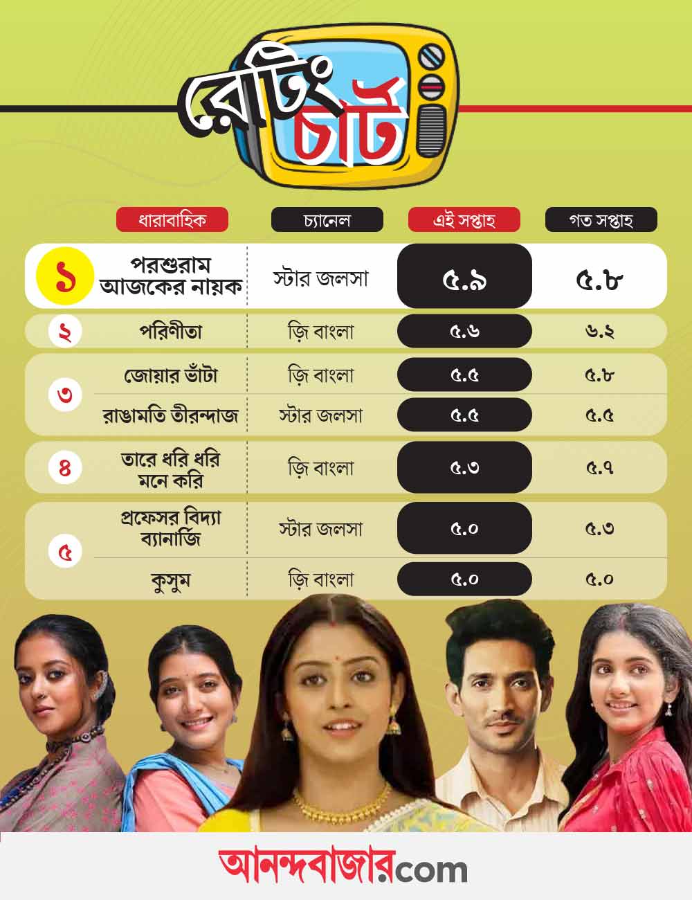 তাই তো এই সপ্তাহেও তালিকায় প্রথমে রয়েছে ‘পরশুরাম আজকের নায়ক’। ইন্দ্রজিৎ বসু এবং তৃণা সাহার জুটি নিয়ে অনেক আলোচনাই হয়েছে। এখন নায়ক-নায়িকার সম্পর্ক মোড় নিয়েছে অন্য দিকে। সেটাও দর্শক বেশ উপভোগ করছে। এই সপ্তাহে ৫.৯ পেয়ে প্রথম স্থানে রয়েছে এই ধারাবাহিক। দ্বিতীয় স্থানে নেমে এসেছে ‘পরিণীতা’। সম্প্রচারের প্রথম সপ্তাহ থেকেই রায়ান-পারুলকে নিয়ে আগ্রহ রয়েছে দর্শকের। আগের সপ্তাহে এই ধারাবাহিকের একটি বিশেষ পর্ব নিয়ে মাতামাতিও হয়েছিল প্রবল। কিন্তু এই সপ্তাহে তাদের টেক্কা দিয়ে এগিয়ে গিয়েছে পরশুরাম। রায়ান-পারুল জুটি চলতি সপ্তাহে পেয়েছে ৫.৬।