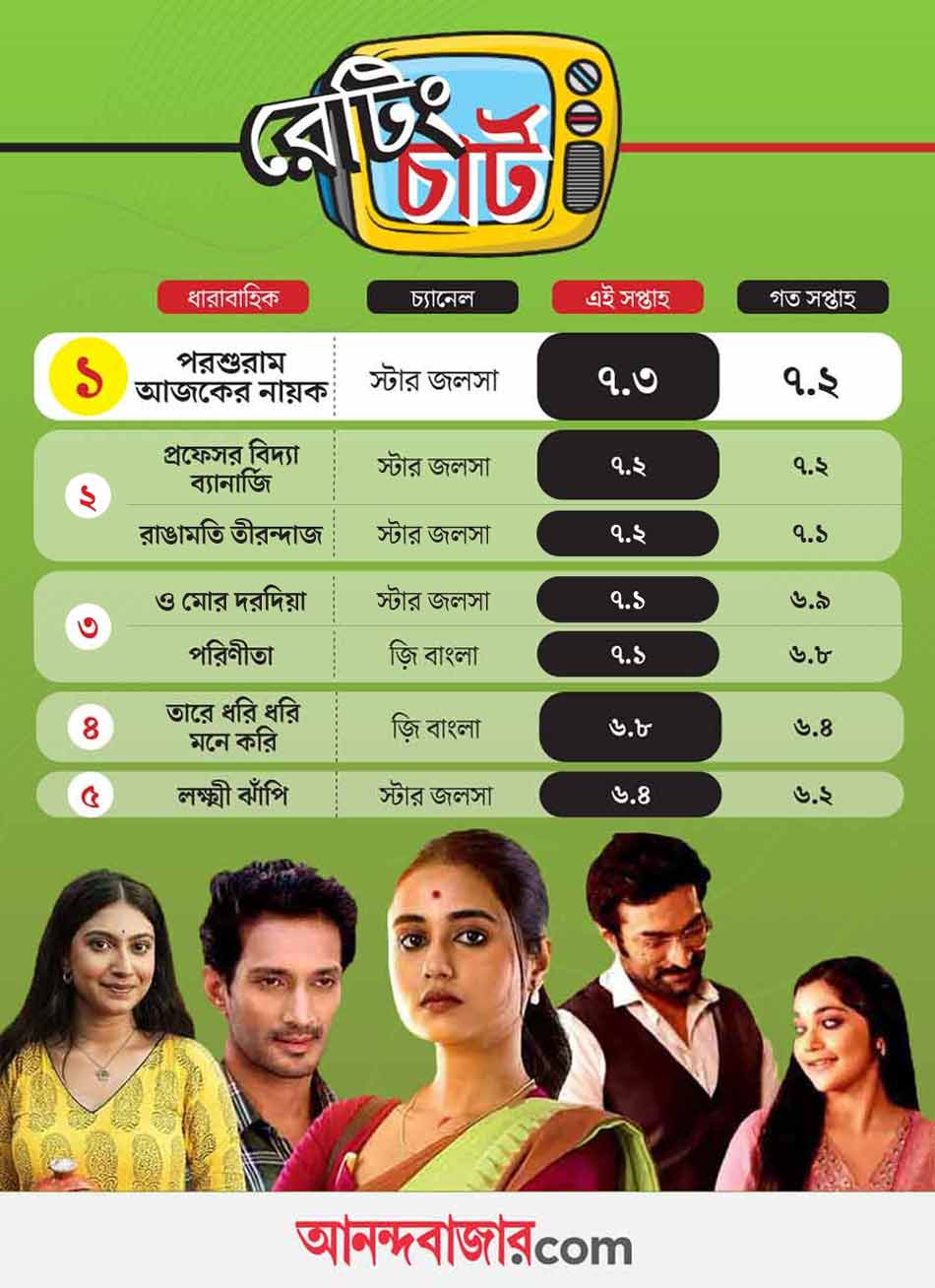 নতুন বছরে টিআরপি তালিকা এদিক-ওদিক হয়ে গিয়েছে। পুরনো অনেকেই চলে গিয়েছে, তার বদলে টিআরপি তালিকায় নতুনদের ভিড়। তবে নতুন বছরেও নিজেদের জায়গা ধরে রেখেছে ‘পরশুরাম আজকের নায়ক’। প্রথম পাঁচে যদিও বেশ কিছু নতুন নাম যুক্ত হয়েছে। কিন্তু বিতর্ক, রোম্যান্সের পরেও জায়গা ধরে রাখতে পারেনি অপর্ণা-আর্যর কাহিনি।