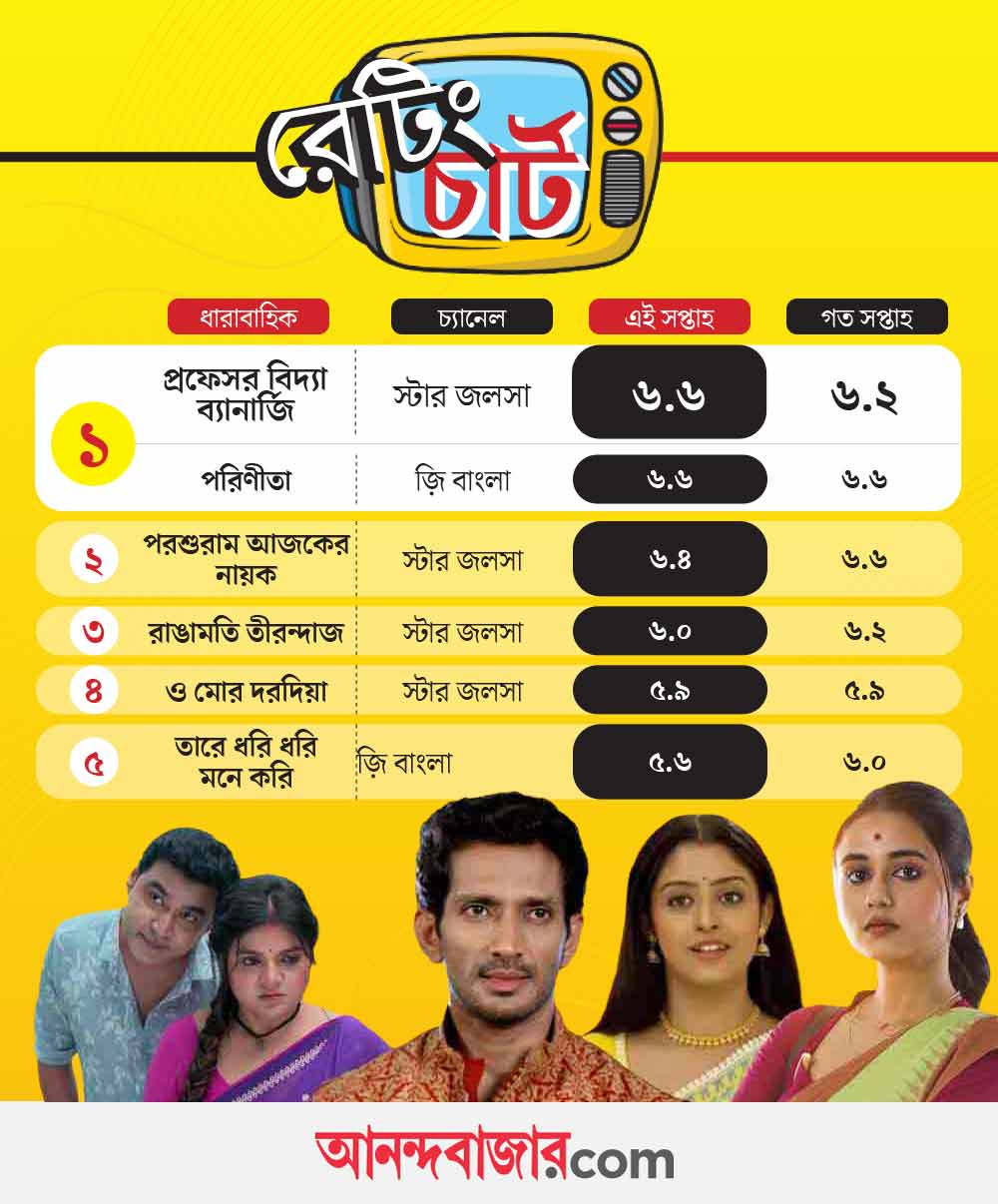 গত দু’সপ্তাহ ধরে টিআরপি তালিকায় ধস। প্রায় সব ধারাবাহিকের নম্বর একসঙ্গে কমে গিয়েছে। চলতি সপ্তাহেও একই চিত্র। নম্বর কমার নেপথ্যে সঠিক কারণ প্রযোজক, পরিচালকদের পক্ষে বলা কঠিন হলেও একাংশের মতে মাধ্যমিক, উচ্চ মাধ্যমিক পরীক্ষা কিছুটা প্রভাব ফেলতে পারে টিআরপিতে। এই সপ্তাহে প্রথম স্থানে রয়েছে দুটি ধারাবাহিক। ‘প্রফেসর বিদ্যা ব্যানার্জি’ এবং ‘পরিণীতা’। যদিও সার্বিক নম্বর কম। তারা পেয়েছে ৬.৬।