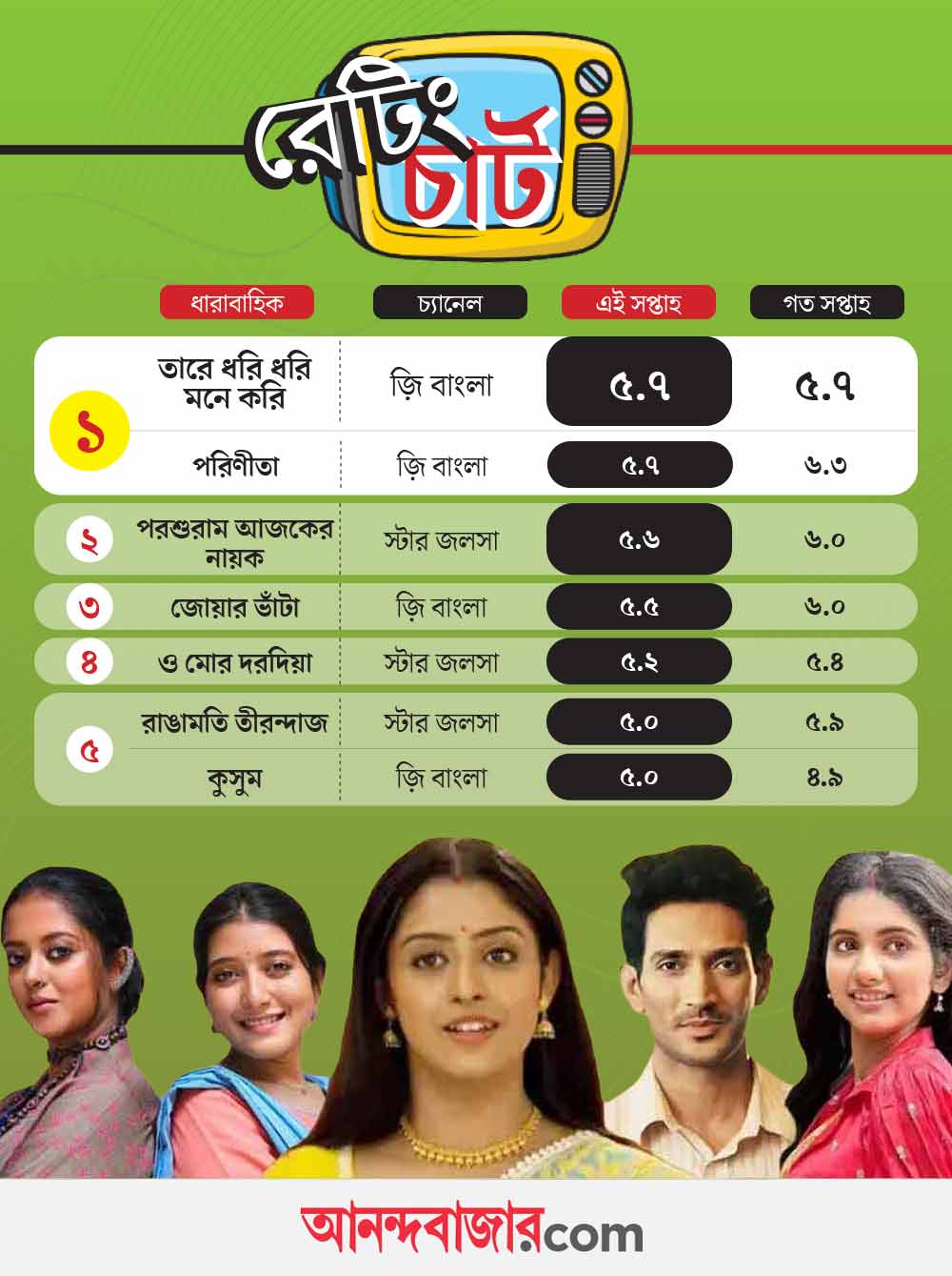 চলতি সপ্তাহে প্রথম স্থানে ‘তারে ধরি ধরি মনে করি’ ছাড়াও রয়েছে ‘পরিণীতা’। এত কিছুর পরেও রায়ান-পারুল নিজেদের জায়গা ধরে রাখতে সফল। তারাও পেয়েছে ৫.৭। দ্বিতীয় স্থানে রয়েছে ‘পরশুরাম আজকের নায়ক’। গত কয়েক মাস ধরে রায়ান-পারুল এবং পরশুরাম-তটিনী—দুটি জুটির হাড্ডাহাড্ডি লড়াই চলছে। সেই তালিকায় নতুন সংযোজন হল ‘তারে ধরি ধরি মনে করি’র গোরা-রূপমঞ্জরী। তবে এই সপ্তাহে পরশুরামের প্রাপ্ত নম্বর ৫.৬। তৃতীয় স্থানে রয়েছে ‘জোয়ার ভাঁটা’। তাদের প্রাপ্ত নম্বর ৫.৫।