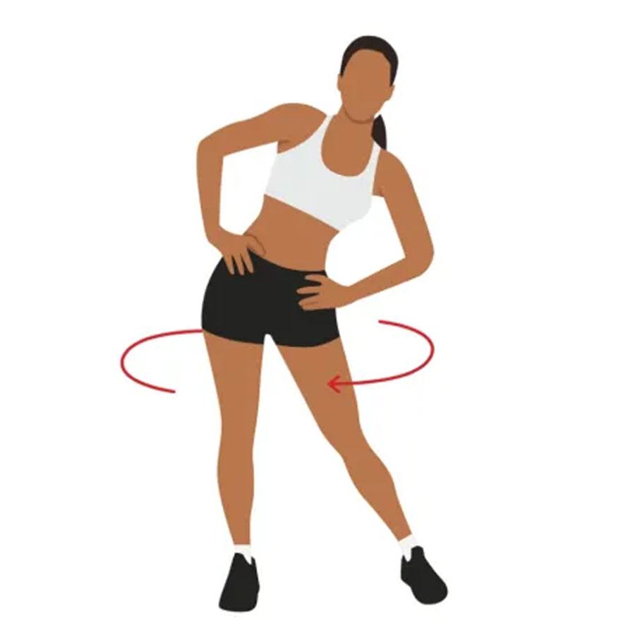 দুই কাঁধের দূরত্বে পা রাখুন। পা দু’টি শক্ত করে স্থির রাখুন। কোমরের নীচের অংশে হাত দু’টিকে রাখতে হবে। এ বার পেলভিস ঘুরিয়ে বড় বৃত্ত তৈরি করতে হবে। এটি অনুশীলন করাও সহজ, কোমরের চারপাশের মেদ ঝরানোর জন্যও কার্যকরী। কোর পেশিকেও সক্রিয় রাখে এই ব্যায়াম।