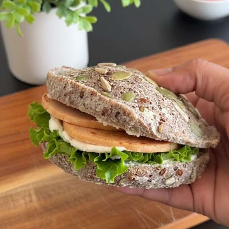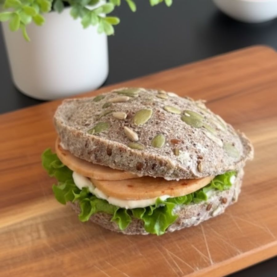 প্রণালী: তিসির বীজ মিহি করে গুঁড়িয়ে নিয়ে তাতে একটি ডিম ফেটিয়ে দিয়ে দিন। নুন, বেকিং পাউডার দিয়ে ভাল ভাবে মিশিয়ে নেওয়ার পরে উপরে কয়েক দানা সূর্যমুখী এবং কুমড়োর বীজ ছড়িয়ে একটি কাচের পাত্রে মাইক্রোওয়েভ করুন দেড় মিনিট মতো। তা হলেই তৈরি হয়ে যাবে স্বাস্থ্যকর পাউরুটি। আড়াআড়ি করে কেটে এর মাঝে পছন্দের পুর দিয়ে দিলেই তৈরি স্যান্ডউইচ।