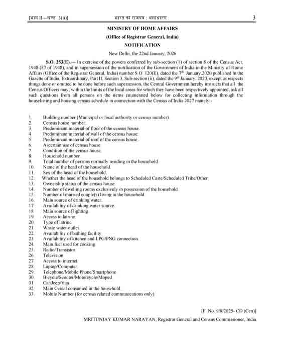 দীর্ঘ ১৪ বছর পরে আগামী ১ এপ্রিল থেকে শুরু হবে দেশের ষোড়শ জনগণনা (২০২৭)-এর প্রথম পর্যায়। তার জন্য ৩৩টি প্রশ্নের তালিকা প্রকাশ করেছে কেন্দ্র। সেই তালিকায় রয়েছে মোবাইল, ল্যাপটপ, ইন্টারনেট থেকে সাইকেল-বাইক সম্পর্কিত প্রশ্নও। মূলত কী ধরনের খাদ্যশস্য ঘরে আনা হয়, জানতে চাওয়া হবে তা নিয়েও।