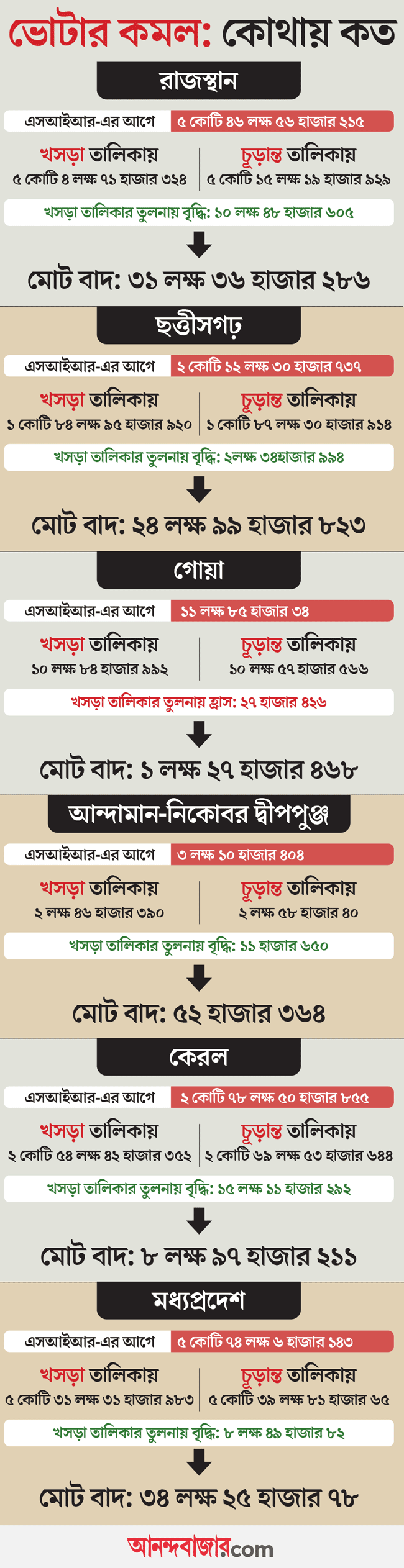 বিহারের পরে পশ্চিমবঙ্গ-সহ মোট ১২টি রাজ্য এবং কেন্দ্রশাসিত অঞ্চলে ভোটার তালিকার বিশেষ নিবিড় সংশোধন (এসআইআর)-এর কাজ শুরু করেছিল কমিশন। পশ্চিমবঙ্গের চূড়ান্ত ভোটার তালিকা এখনও প্রকাশ্যে আসেনি। আগামী ২৮ ফেব্রুয়ারি পশ্চিমবঙ্গের এসআইআর পরবর্তী চূড়ান্ত ভোটার তালিকা প্রকাশিত হবে। ইতিমধ্যে গুজরাত, পুদুচেরি এবং লক্ষদ্বীপের চূড়ান্ত তালিকা প্রকাশ্যে এসেছে। শনিবার প্রকাশ্যে এল আরও পাঁচ রাজ্য এবং এক কেন্দ্রশাসিত অঞ্চলের চূড়ান্ত তালিকা। এর মধ্যে রাজস্থান, ছত্তীসগঢ়, মধ্যপ্রদেশ এবং গোয়া— তিনটি রাজ্যেই বর্তমানে বিজেপির সরকার রয়েছে। কেন্দ্রশাসিত অঞ্চল আন্দামান-নিকোবর দ্বীপপুঞ্জের সাংসদও বিজেপির।