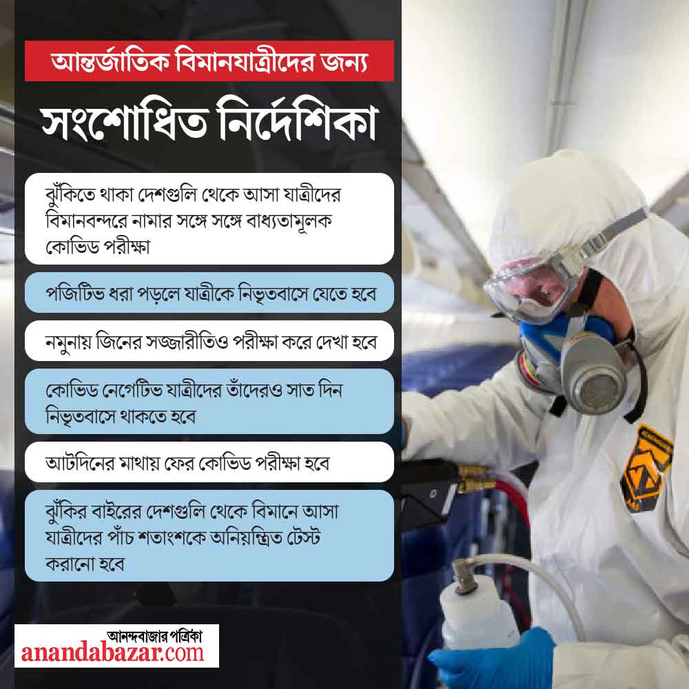 যে যাত্রীদের পরীক্ষার ফল নেগেটিভ হবে তাঁদেরও সাত দিন নিভৃতবাসে থাকতে হবে। আট দিনের মাথায় তাঁদের ফের কোভিড পরীক্ষা করানো হবে। ঝুঁকির বাইরের দেশগুলি থেকে বিমানে আসা যাত্রীদের পাঁচ শতাংশকে টেস্ট করানো হবে।