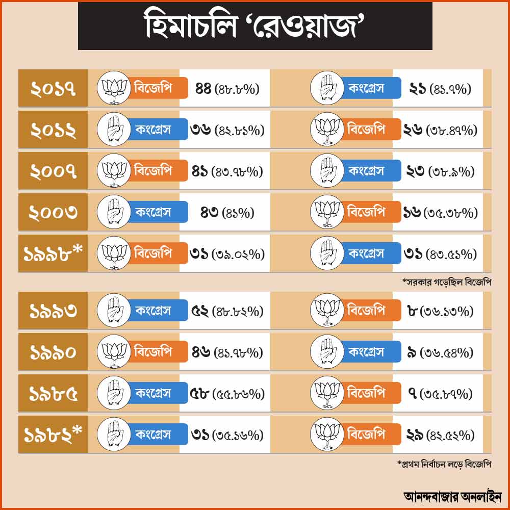 ১৯৮২ সাল থেকেই মত বদলানোর রেওয়াজ হিমাচলে। ওই বছরই প্রথম হিমাচল প্রদেশের বিধানসভা নির্বাচনে লড়াইয়ের ময়দানে নেমেছিল বিজেপি। তার আগে কংগ্রেসের মূল প্রতিদ্বন্দ্বী ছিল জনতা পার্টি। যদিও ক্ষমতায় মূলত রাজ করেছে কংগ্রেসই। ১৯৮২ সালে প্রথম বছর বিধানসভা ভোটে লড়েই ২৯টি আসন পেয়েছিল বিজেপি। পরের বছর অবশ্য সেই আসন সংখ্যা কমে দাঁড়ায় ৭-এ। তার পর থেকে ২০১৭ সাল পর্যন্ত রেওয়াজ বিশেষ বদলায়নি। বস্তুত ১৯৮৫ সাল থেকে কোনও রাজনৈতিক দলই ৫ বছরের বেশি রাজ করেনি হিমাচলে। ১৯৯৮ সালে শুধু হিসাব সামান্য গুলিয়ে গিয়েছিল। রেওয়াজ অনুযায়ী সে বার বিজেপির জেতার কথা কিন্তু ফল হয়েছিল ত্রিশঙ্কু। কংগ্রেস এবং বিজেপি— দু’দলই ৩১টি করে আসন জিতেছিল হিমাচলে। তবে শেষপর্যন্ত বিজেপিই অন্য স্থানীয় দলের সঙ্গে হাত মিলিয়ে সরকার গড়ে। বৃহস্পতিবার গণনার যা ধারা, তাতে অনেকেই মনে করছেন ২৪ বছর আবার ত্রিশঙ্কু হতে চলেছে হিমাচলে হয়তো কোনও দলই শেষ পর্যন্ত জাদু সংখ্যা ছুঁতে পারবে না।