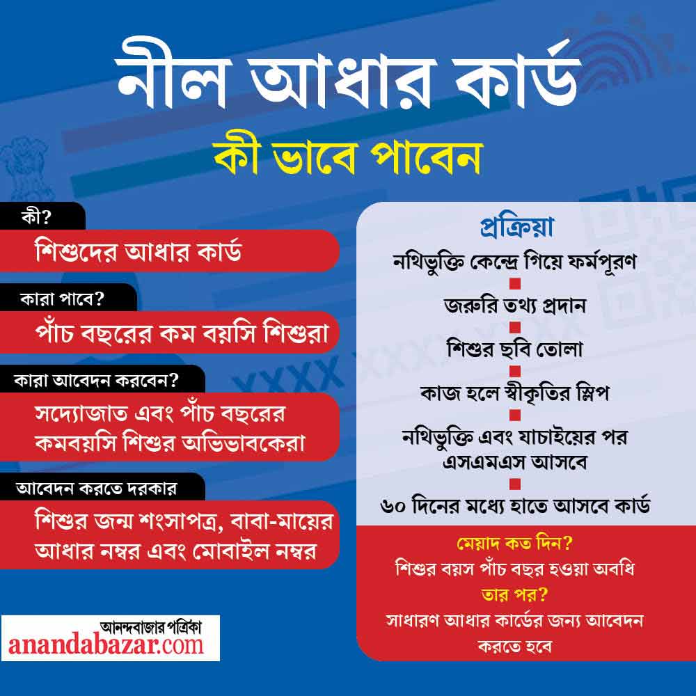 নীল আধার কার্ড আদতে শিশুদের জন্য সরকারের দেওয়া বিশেষ পরিচয় পত্র। যার বৈধতা শিশুটির পাঁচ বছর বয়স পর্যন্ত। শিশুদের ওই আধারকার্ডের প্রচলন হয় ২০১৮ সালে।