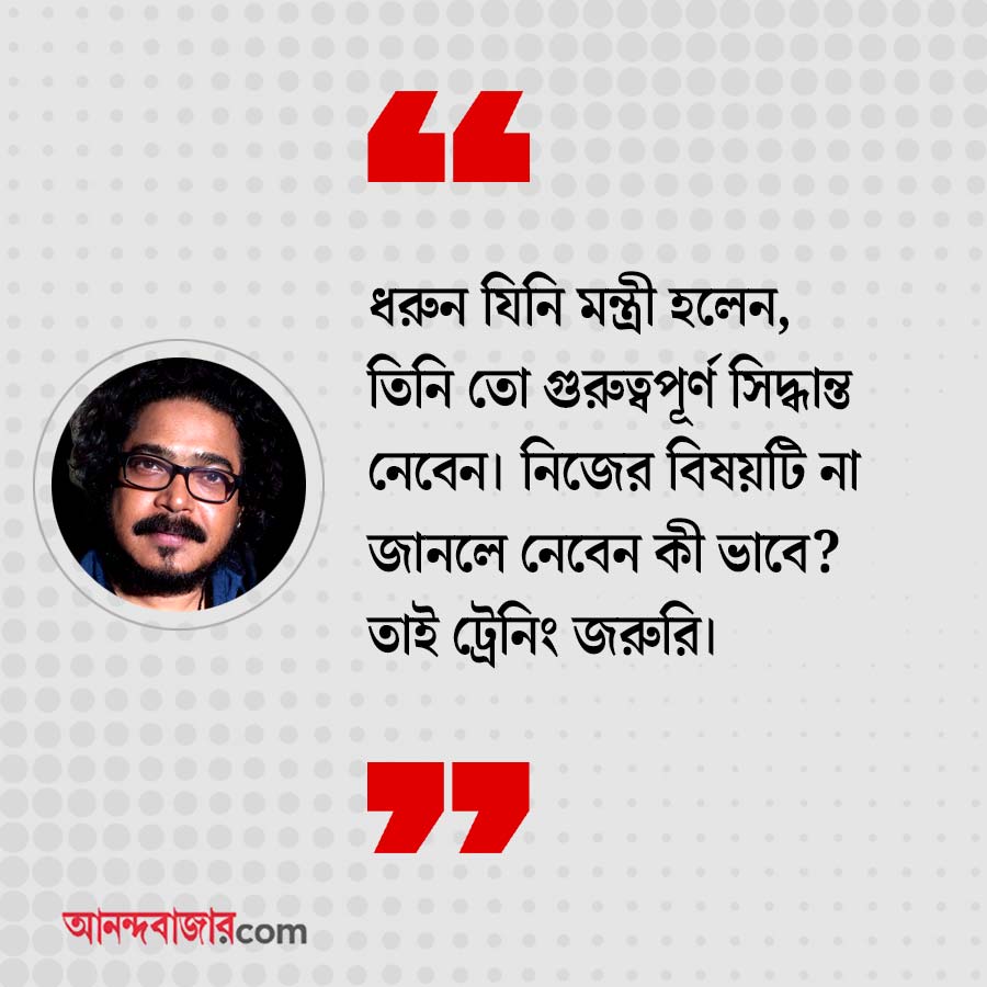 সনাতন: চাকরি পেতে যদি পরীক্ষা দিতে হয়, তবে প্রার্থী হওয়ারই বা পরীক্ষা হবে না কেন? তা ছাড়া, ধরুন যিনি মন্ত্রী হলেন, তিনি তো গুরুত্বপূর্ণ সিদ্ধান্ত নেবেন। নিজের বিষয়টি না জানলে নেবেন কী ভাবে? তাই ট্রেনিং জরুরি।
