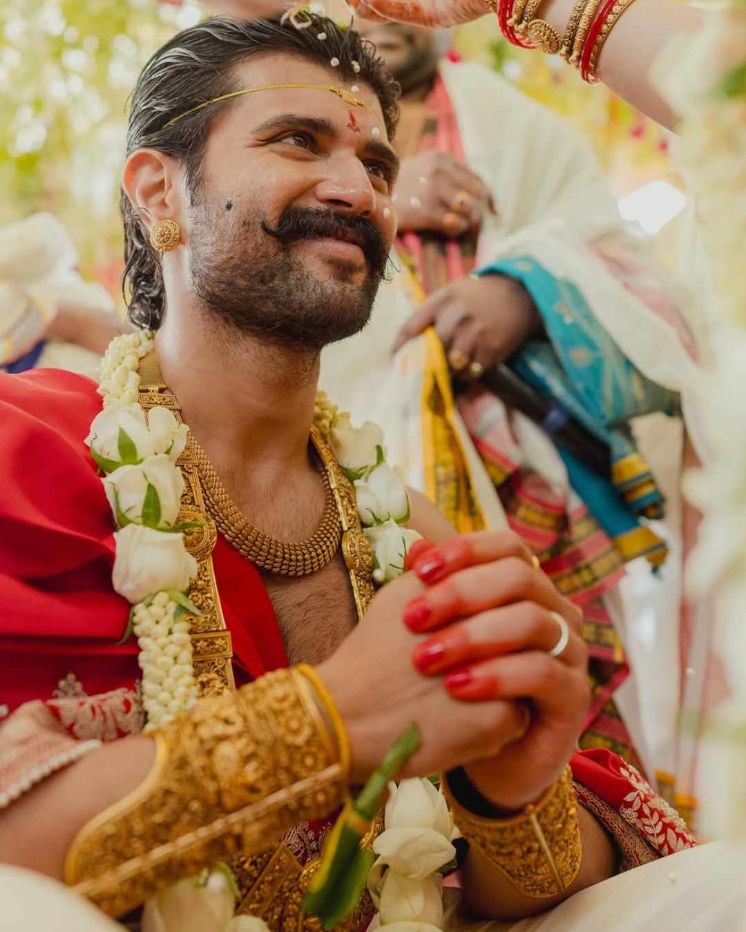 বিজয় পরেছিলেন অনুজ্জ্বল সোনালি সুতোর কাজ করা সাদা ধুতি আর একই ধরনের সুতোর নকশা করা লাল উত্তরীয়। সেই সাজ আর গয়নার সঙ্গে চোখে পড়ছিল বিজয়ের সাজের আরও একটি বিশেষত্ব। হাতে আর পায়ে আলতা পরেছিলেন রশ্মিকার নায়ক। ঠিক যে ভাবে মেয়েরা মেহন্দি বা আলতার রঙে হাত এবং পা রাঙান বিয়ের আগে, সে ভাবেই বিজয়ের হাত এবং পায়ের আঙুল রাঙানো হয়েছিল আলতায়। সঙ্গে ভিজে চুল ব্যাকব্রাশ করে আঁচড়ানো। কপালে বাঁধা ‘বাসিকম’। যা তেলুগুমতে বিবাহের অবিচ্ছেদ্য অঙ্গ। বর-বধূ উভয়কেই পরতে হয় হলুদ সুতোয় বাঁধা সোনার তাবিজের মতো দেখতে অলঙ্কার। যা স্বামী-স্ত্রী-র আত্মিক বন্ধনের প্রতীক।
