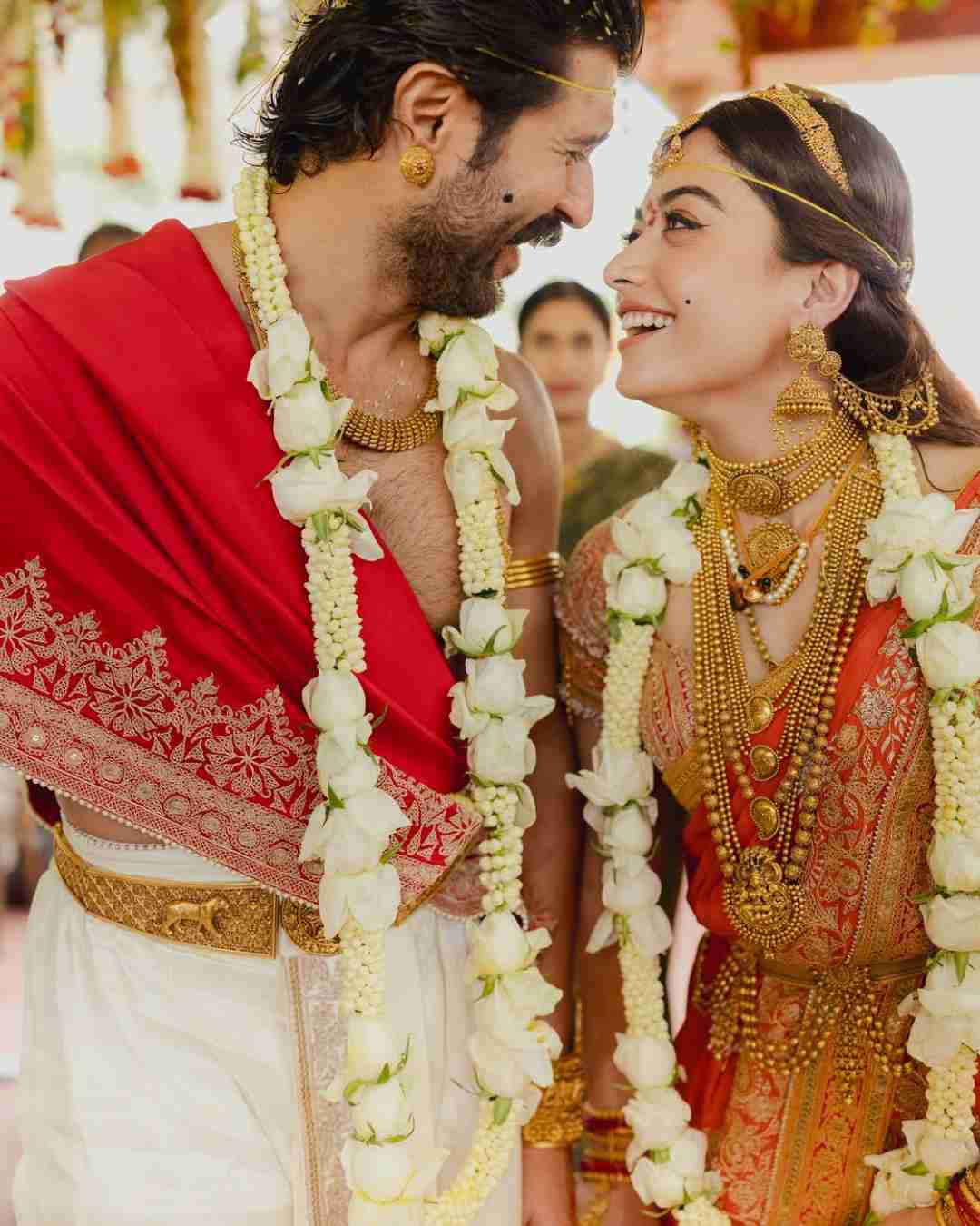 এই পোশাকে বিজয় বিয়ের মণ্ডপে এসেছিলেন ঘোড়ায় চড়ে। কপালে তিলক, সাদা গোলাপের সাজ আর মুখের মিষ্টি হাসিটি অমলিন। বোঝা গেল, কেন বিজয়ের ছবি ইনস্টাগ্রামে পোস্ট করে রশ্মিকা লিখেছেন, ‘‘আয়্যাম সো সো সো সো এক্সাইটেড টু বিকামিং ইয়োর ওয়াইফ, টু বি ইয়োর ওয়াইফ, টু বি কলড ইয়োর ওয়াইফ!’’ অর্থাৎ ‘‘তোমার স্ত্রী হতে পেরে আমি দারুণ উত্তেজিত। উত্তেজিত তোমার স্ত্রীর হওয়ার যোগ্য হয়ে উঠতে পারার জন্য। তোমার স্ত্রী হতে পেরে এবং তোমার স্ত্রী বলে আগামী দিনে আমাকে সম্বোধিত করা হবে বলে উত্তেজিত আমি।’’