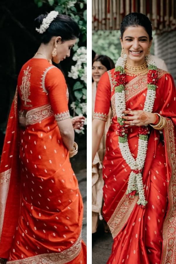 বছর শেষের মুখে বিয়ে করেন দক্ষিণের অভিনেত্রী সমান্থা রুথ প্রভু। কনের জারদৌসি কাজের লাল বেনারসিকে ছাপিয়ে গেল টুকটুকে লাল ব্লাউজ়টি। সেটিই থাকল হালকা গয়না, অল্প ফুলের ব্যবহারে বিয়ের সাজের প্রধান আকর্ষণ হয়ে। আপাতদৃষ্টিতে পরিচ্ছন্ন কাটের কনুই পর্যন্ত ঢাকা গলাবন্ধ ব্লাউজ়টি দেখলে একটু বেশি রক্ষণশীল মনে হতে পারে। কিন্তু তার বাইরে ওই ব্লাউজ় বহন করছিল বিয়ে, সম্পর্ক এবং জীবন সংক্রান্ত বিশেষ বার্তা। সমান্থার ব্লাউজ়ের পিঠে একটি নকশা এঁকে দিয়েছিলেন বাঙালি শিল্পী তথা পোশাক পরিকল্পক জয়তী বসু। নকশাটি একটি গাছের। যার শিকড় নেমেছে সমুদ্রের জলের নীচে। আর শিখর ছুঁয়ে আছে দেবীর তৃতীয় নেত্র। মাঝে সজীব পাতা ছড়িয়ে আছে গাছের শাখা প্রশাখায়। বাংলার জামদানি নকশার অনুপ্রেরণায় সুতোর ফোঁড়ে আঁকা ওই গাছ আসলে জীবনবৃক্ষ। এ বৃক্ষের শিকর ছুঁয়ে থাকে পাতাল আর শিখর ছোঁয় স্বর্গ। যা দু’ধরনের দুনিয়া জুড়ে যাওয়ার কথা বলে। আর তাঁর জারদৌসি শাড়ির সঙ্গে বাংলার জামদানি কাজের ব্লাউজই করে তুলেছে বিয়ের কনেকে সকলের থেকে আলাদা।